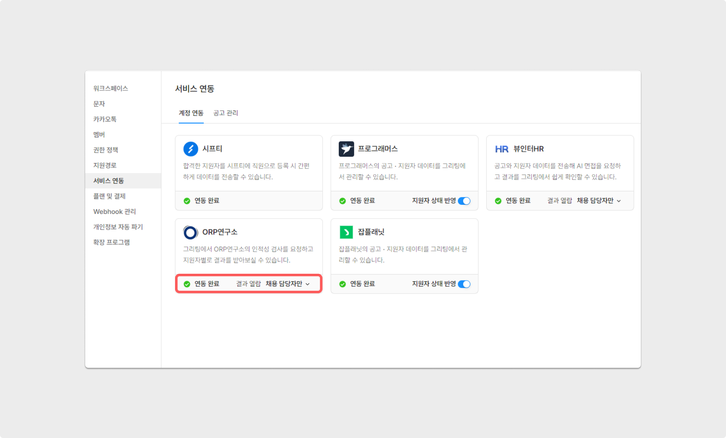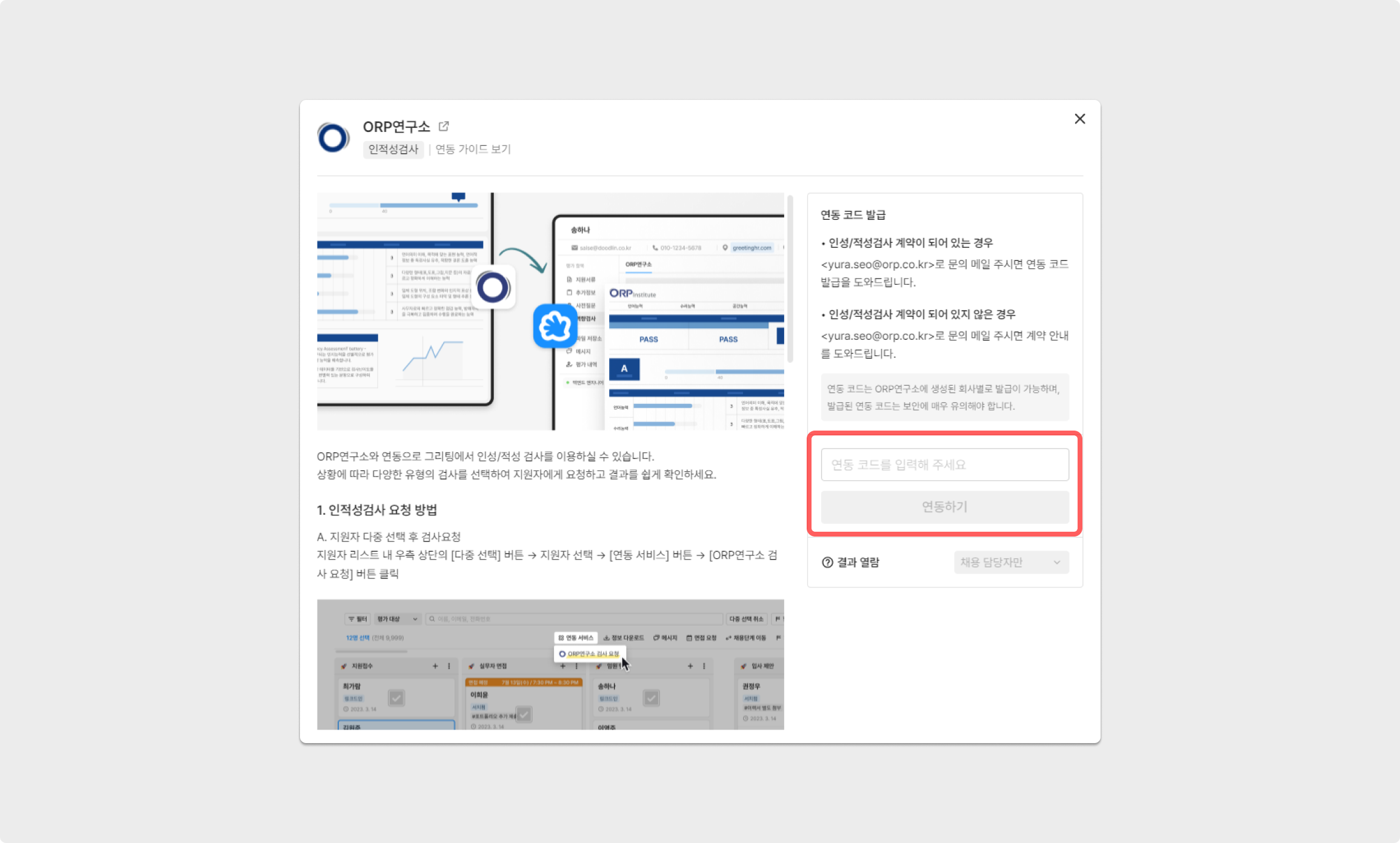인성/적성검사 계약이 되어 있는 경우: yura.seo@orp.co.kr로 문의 메일 주시면 연동 코드 발급을 도와드립니다.
