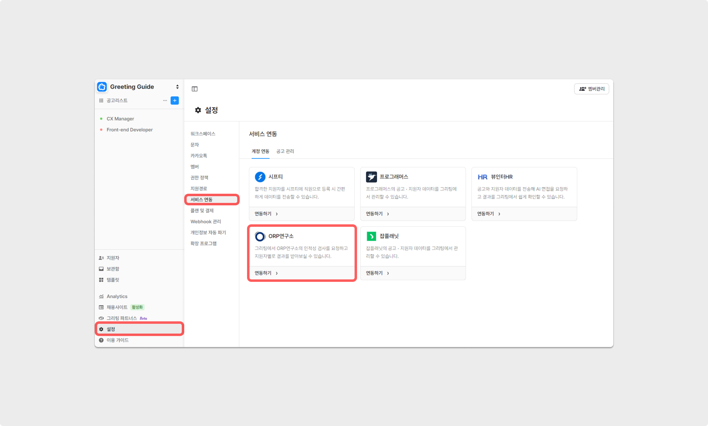설정 → 서비스 연동에 접근하여, ORP연구소의 연동하기 버튼을 클릭해 주세요.