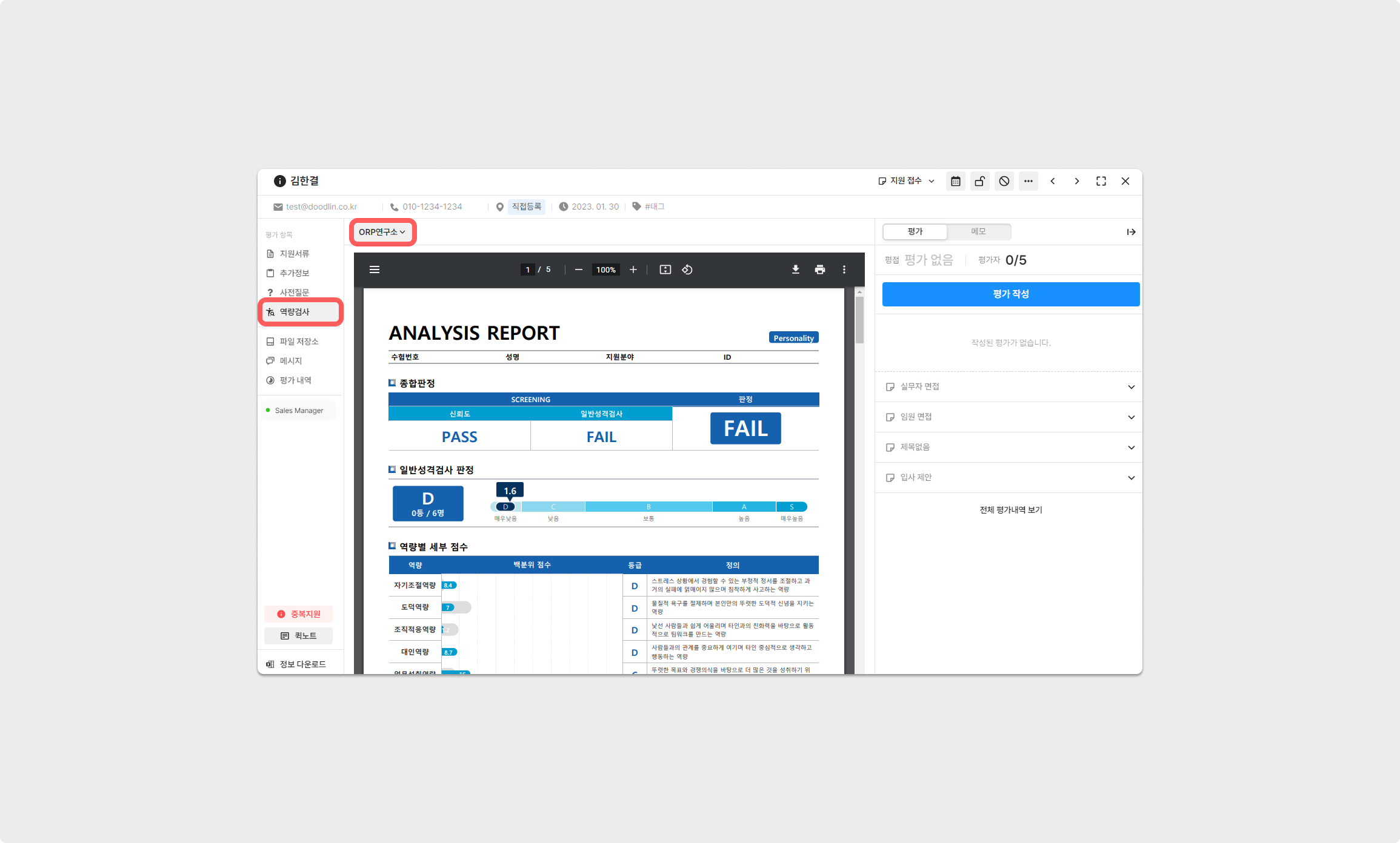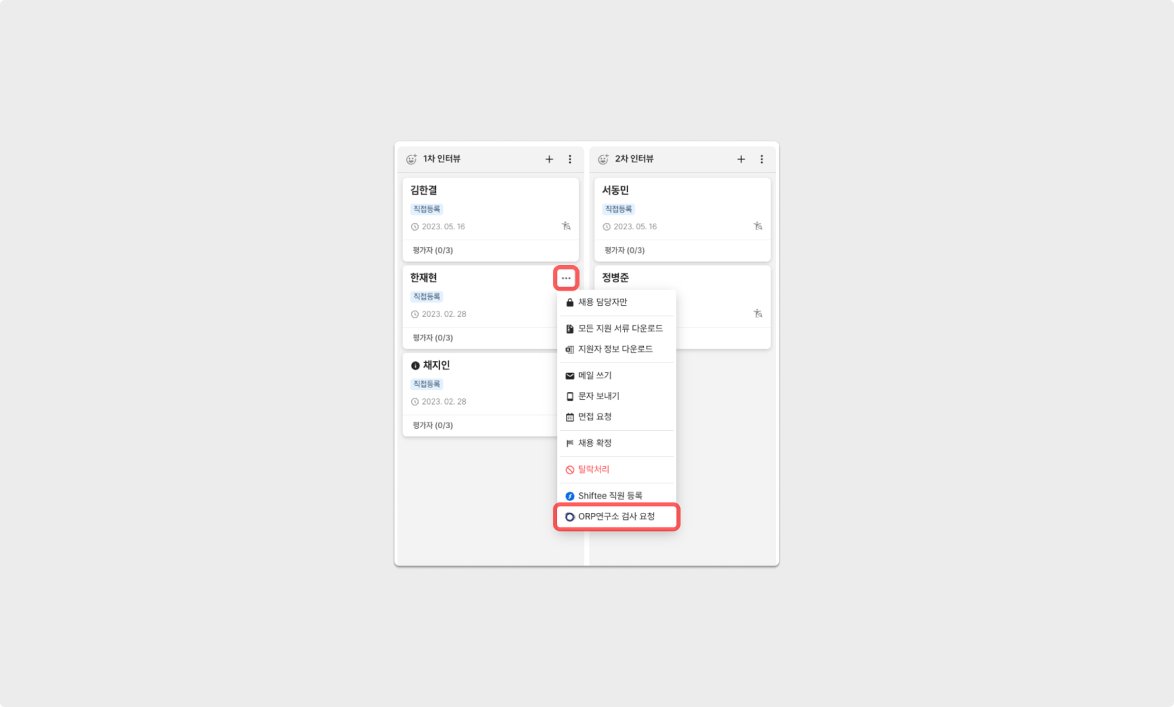 지원자 카드의 '…' 버튼 → ORP연구소 검사 요청 버튼 클릭