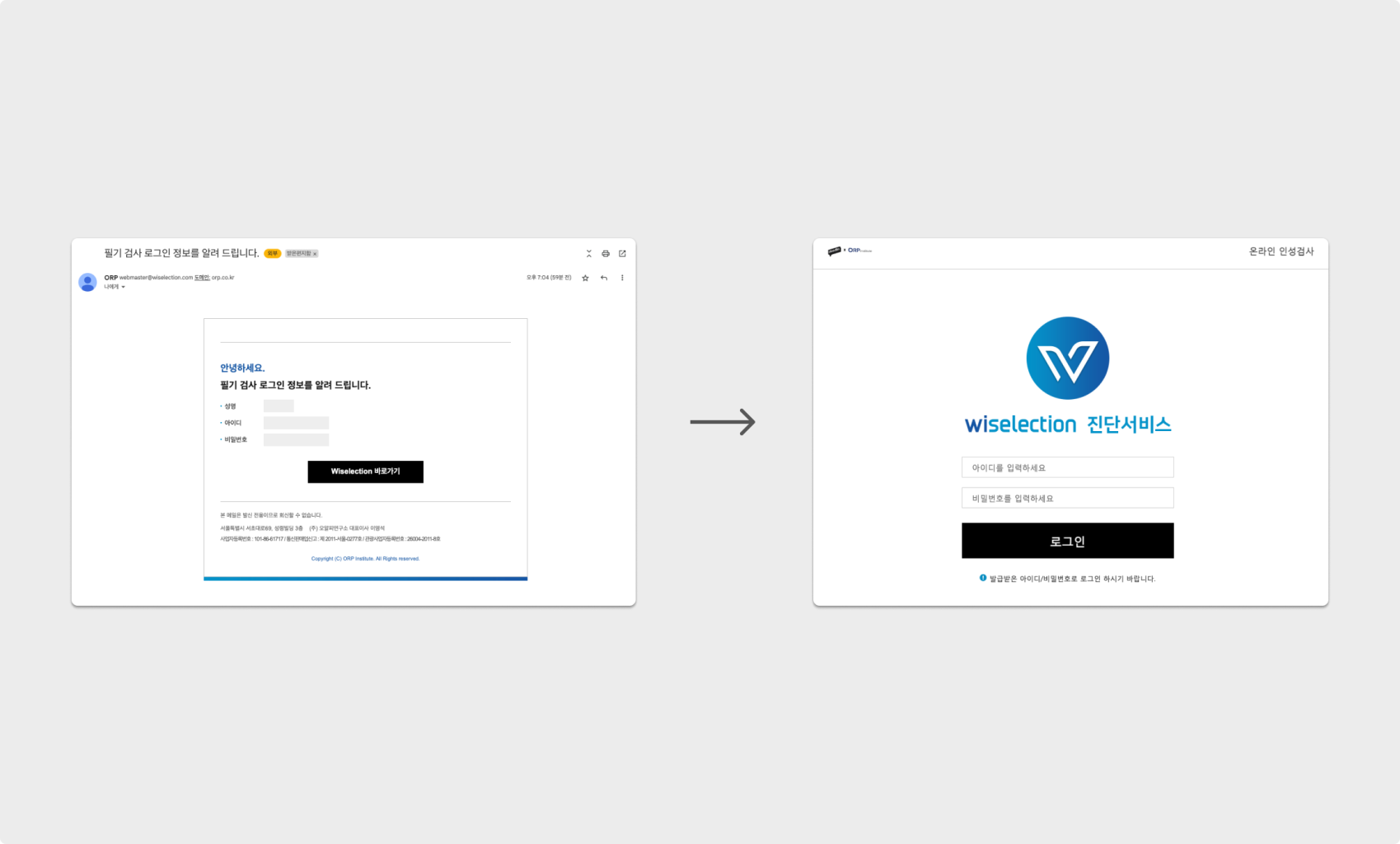 지원자는 메일을 통해 안내를 받게 되며, 메일 내에 검사를 받을 수 있는 링크와 로그인 정보가 기재되어 있습니다. 이후, 검사 페이지에서 안내 받은 로그인 정보를 통해 검사를 시작할 수 있습니다.
