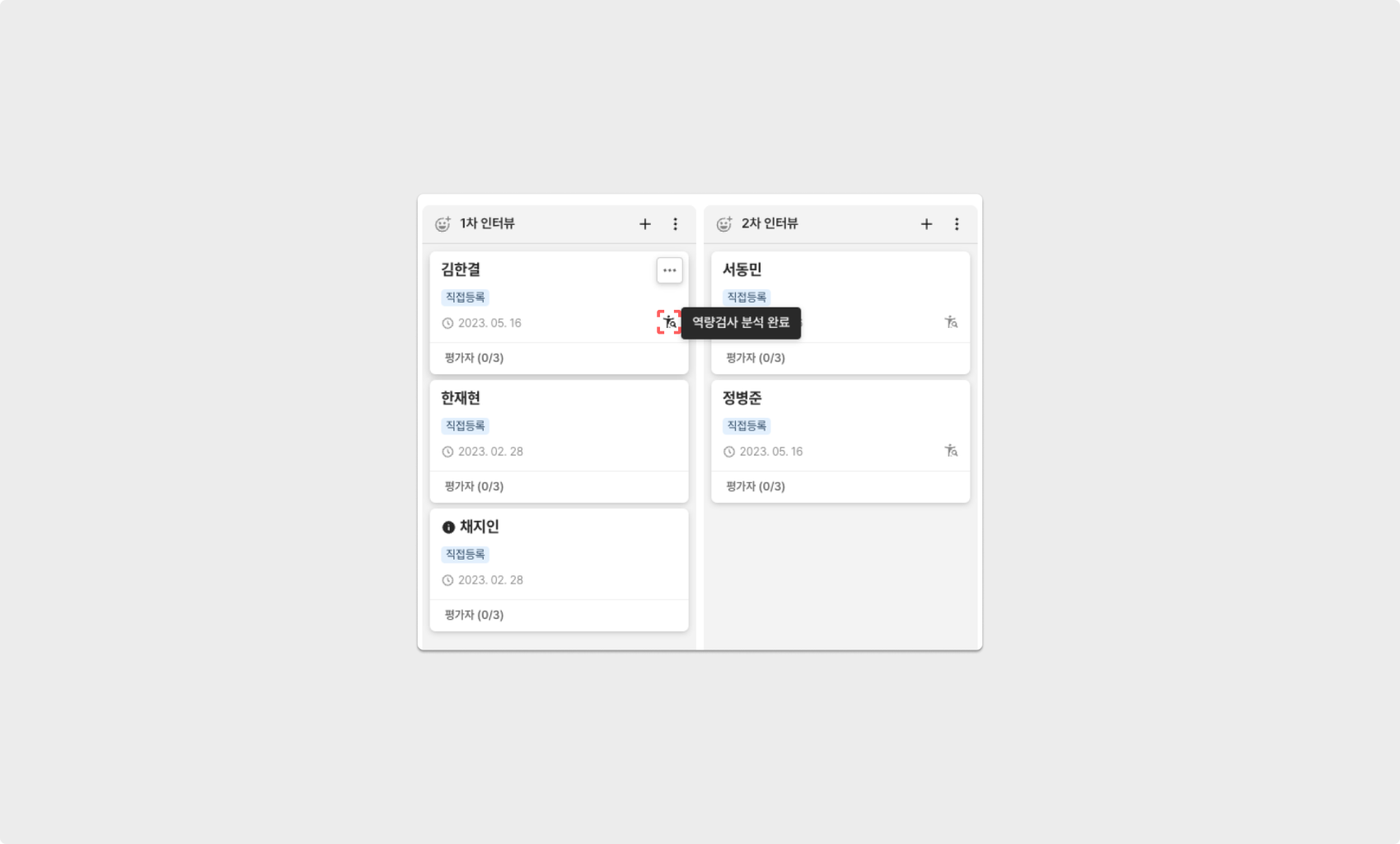 역량검사를 완료한 지원자는 지원자 카드에서 아이콘과 함께 '역량검사 분석 완료' 문구를 확인할 수 있습니다.