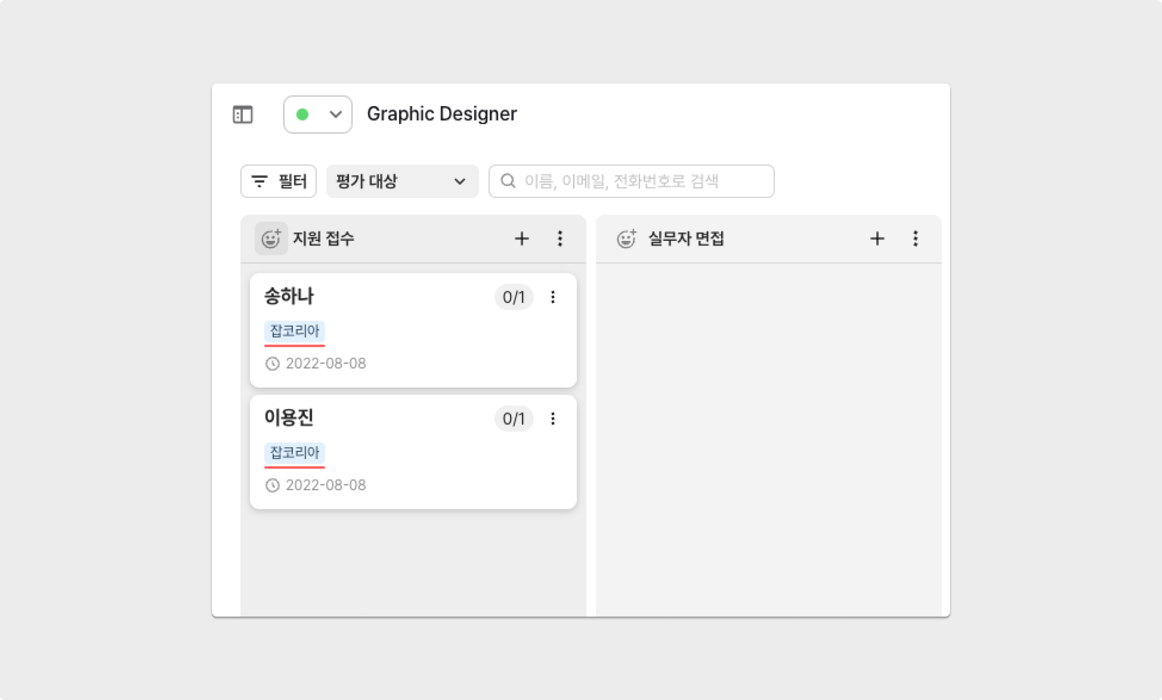 칸반 뷰/테이블 뷰 우측 상단의 '필터'를 이용하여 지원경로별 지원자를 확인할 수 있습니다.
