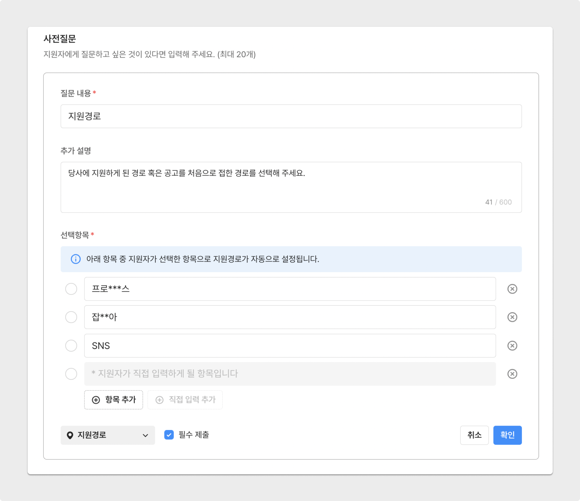 공고의 사전 질문을 통해, 지원자가 객관식 형태로 지원 경로를 직접 선택할 수 있습니다.