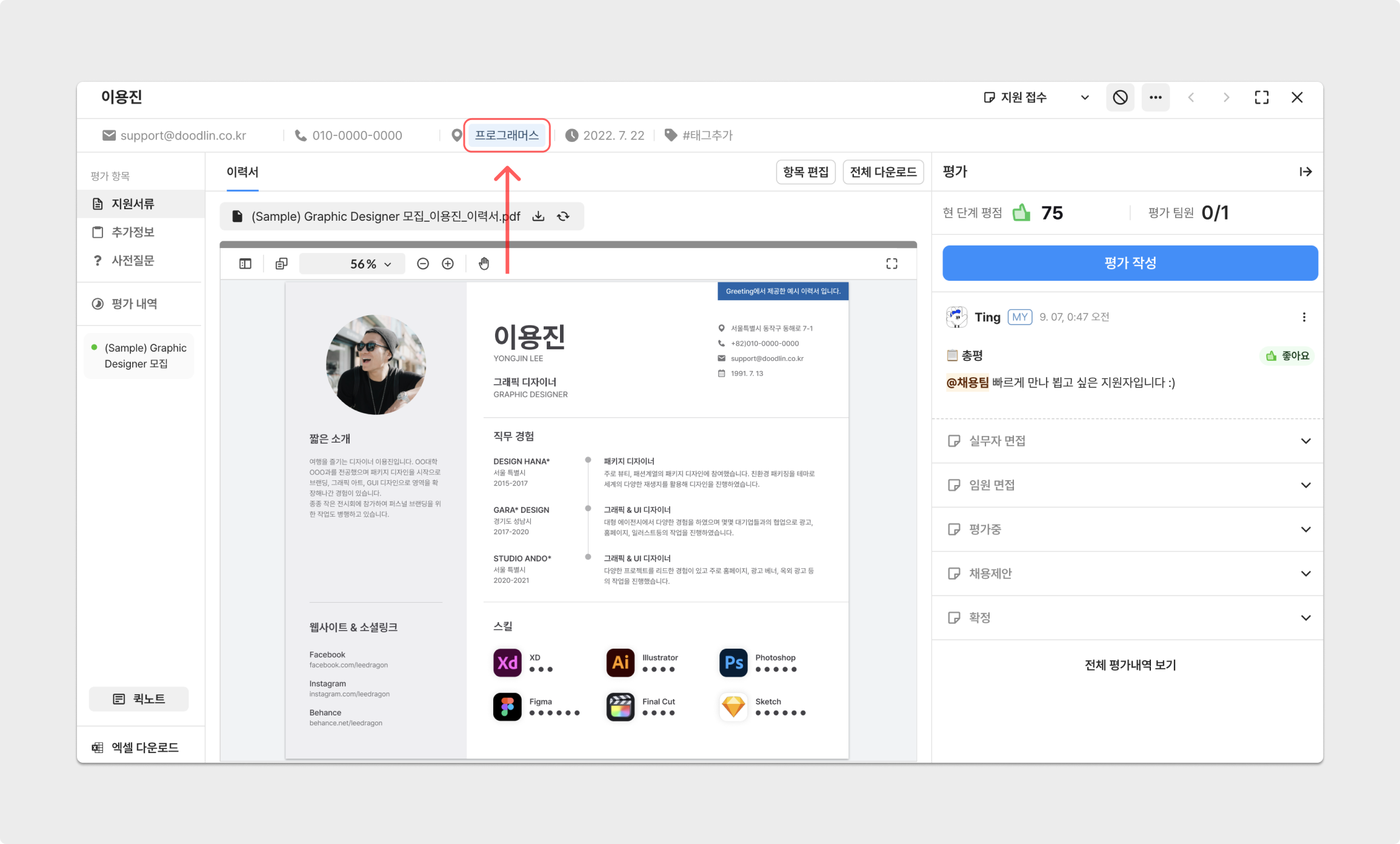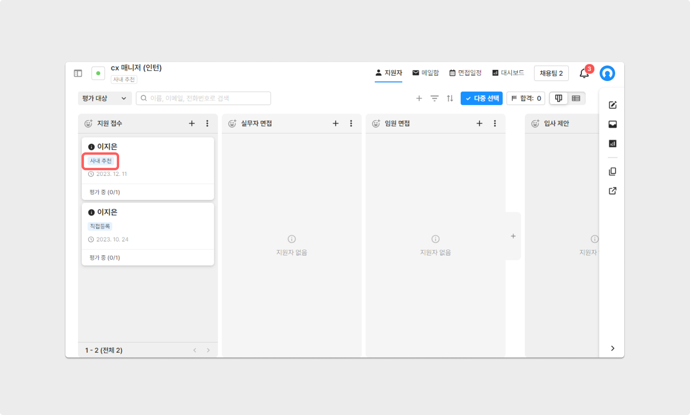 사내 추천 경로로 인입된 지원자의 경우, '사내 추천'으로 지원경로가 자동 표기됩니다.