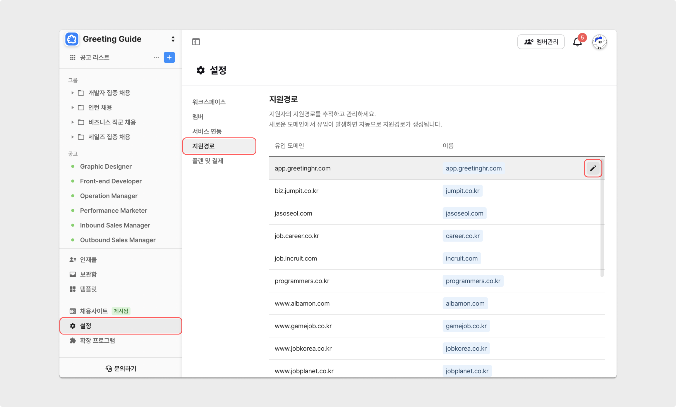 지원자가 '그리팅을 통해 생성한 공고' 직전에 접속한 웹사이트의 URL을 추적해, 지원이 완료되었을 때 지원경로를 나타내는 기능입니다.