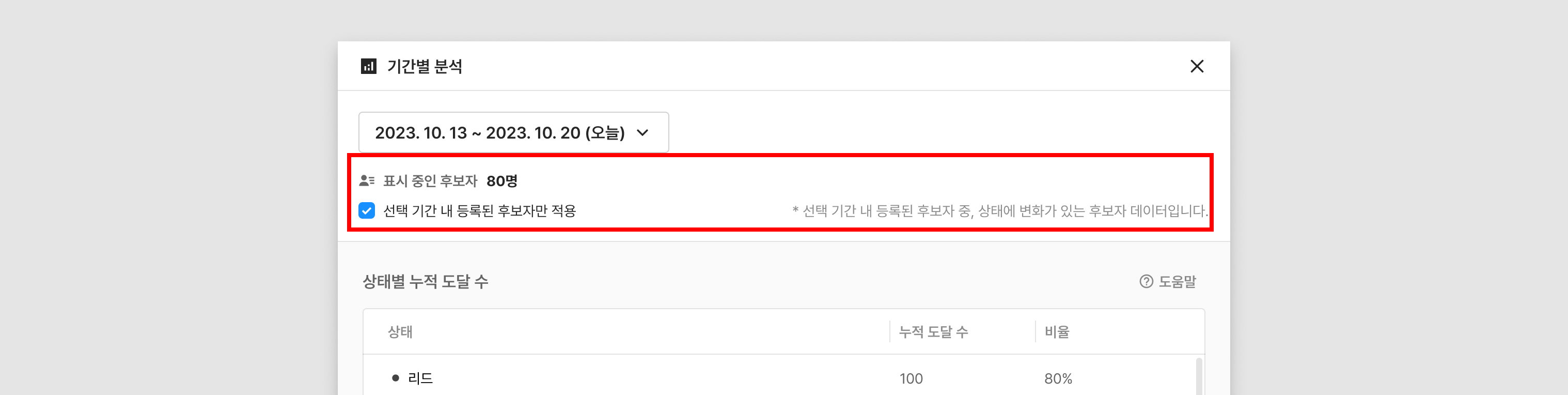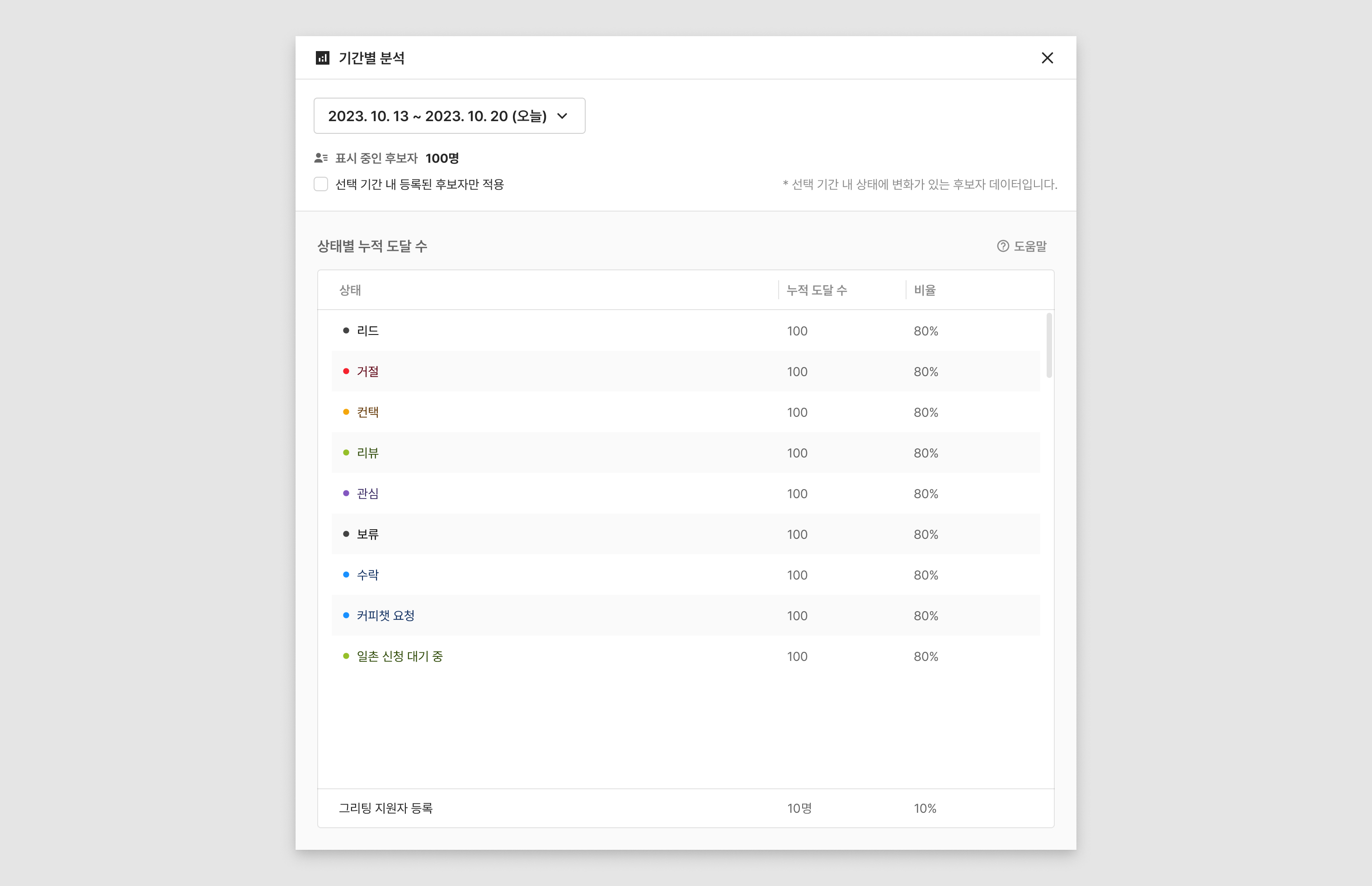 아래에 표시되는 데이터는 해당 프로젝트 내모든 후보자 중에서 선택된 기간에 상태 변화가 있었던 수를 집계한 것입니다.