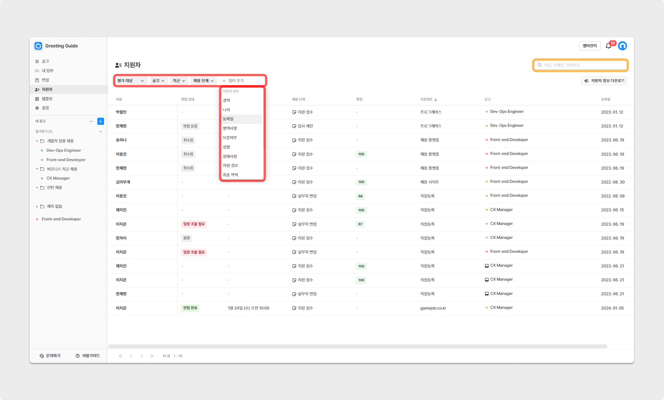 우측 상단의 검색창을 통해 지원자를 이름/이메일/전화번호로 검색할 수 있으며, 평가대상/공고/직군/채용단계 등의 다양한 조건으로 필터링할 수 있습니다.