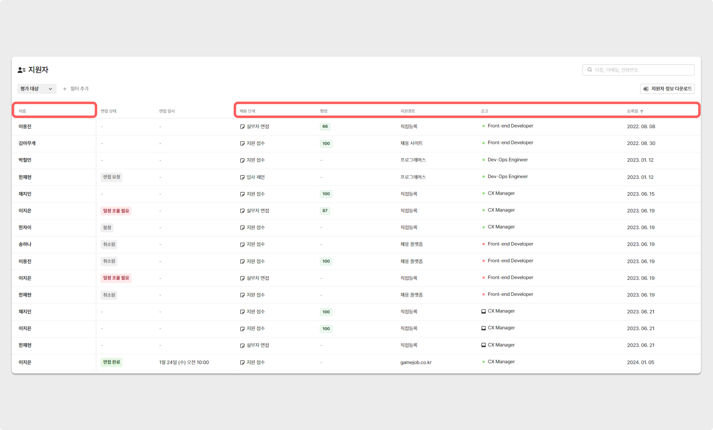 또한, [이름]과 [채용 단계], [평점], [지원경로], [공고], [등록일] 탭을 클릭해 이름과 등록일의 순으로 정렬 기준을 설정할 수 있습니다.