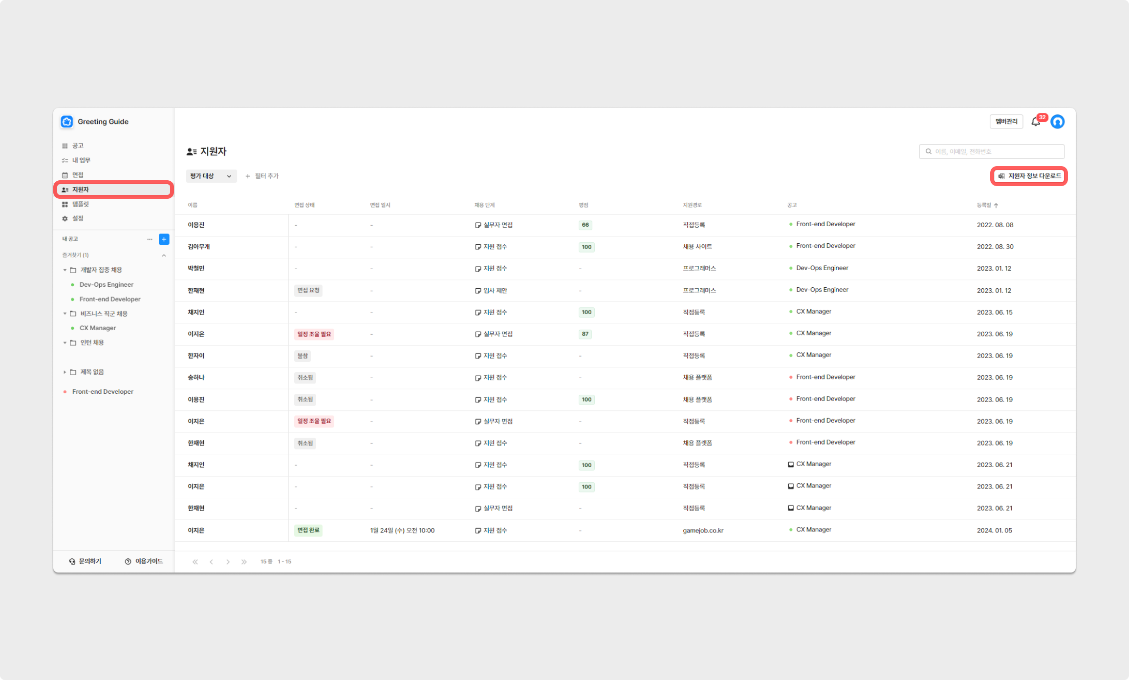 [지원자] 탭을 통해 본인이 속한 공고의 모든 지원자를 확인할 수 있습니다. 각 지원자를 클릭하면 지원자 상세 페이지를 열람할 수 있으며, 공고별 권한 설정에 따라 본인이 열람할 수 없는 지원자는 접근이 불가합니다.