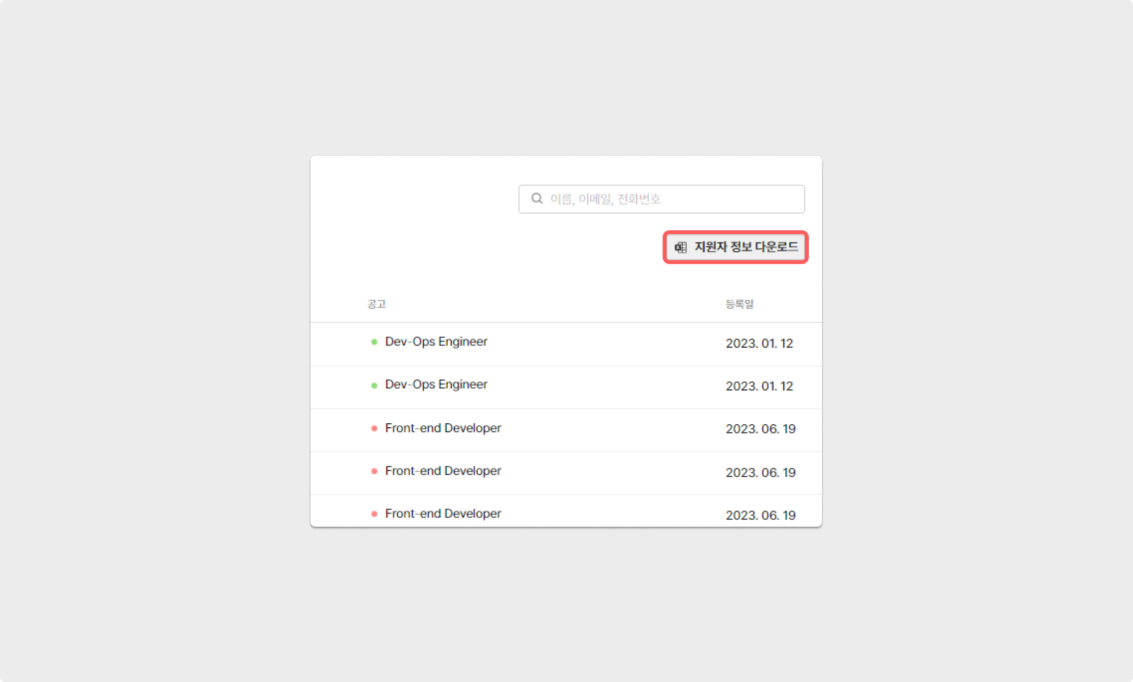 [지원자] 탭에서 전체 지원자의 데이터를 [엑셀로 다운로드] 버튼을 통해 다운로드 할 수 있습니다. 본인이 속한 공고의 지원자만 다운로드 가능하며, 공고별 권한 설정에 따라 본인이 열람할 수 없는 지원자는 다운로드 파일에 포함되지 않습니다.