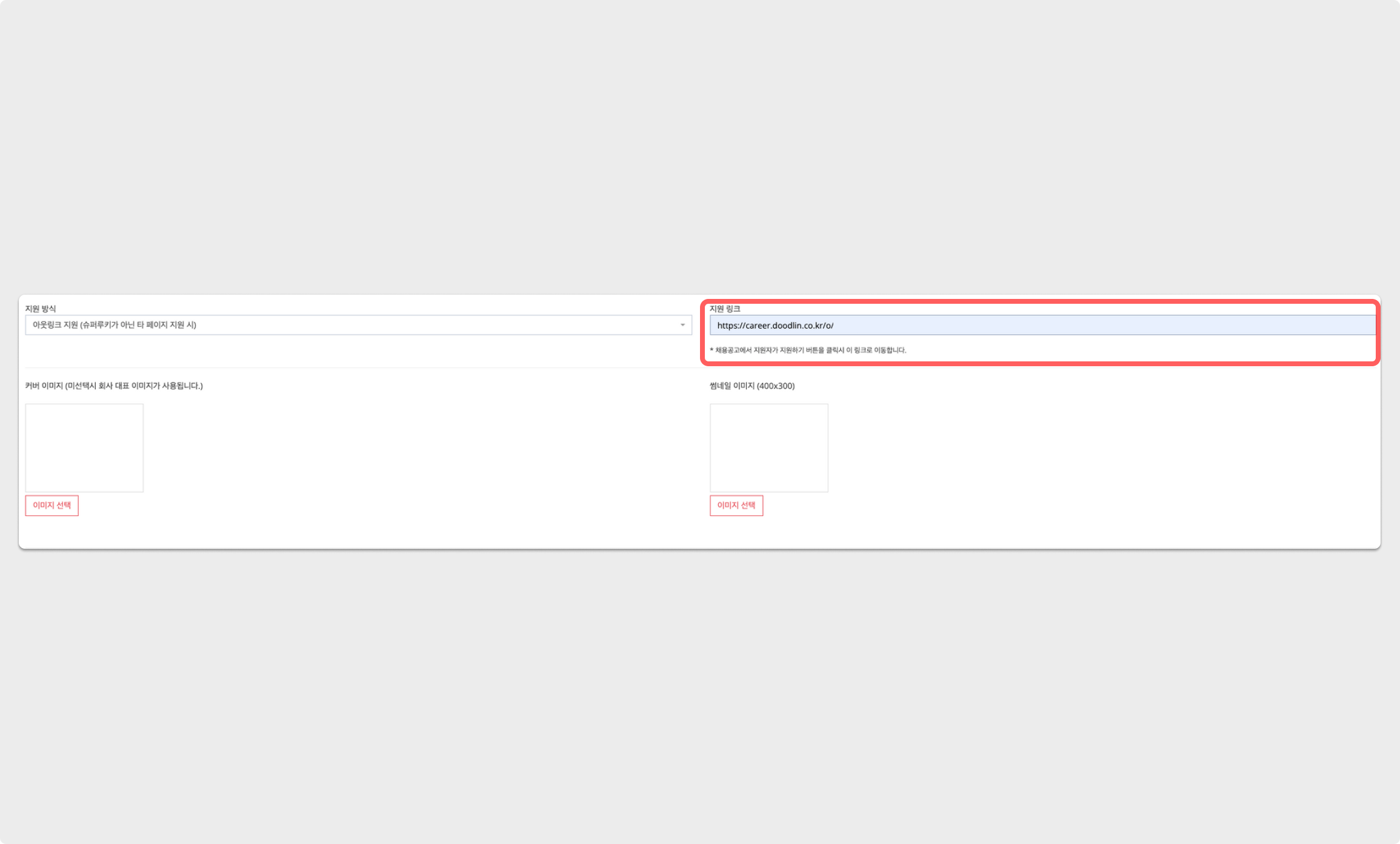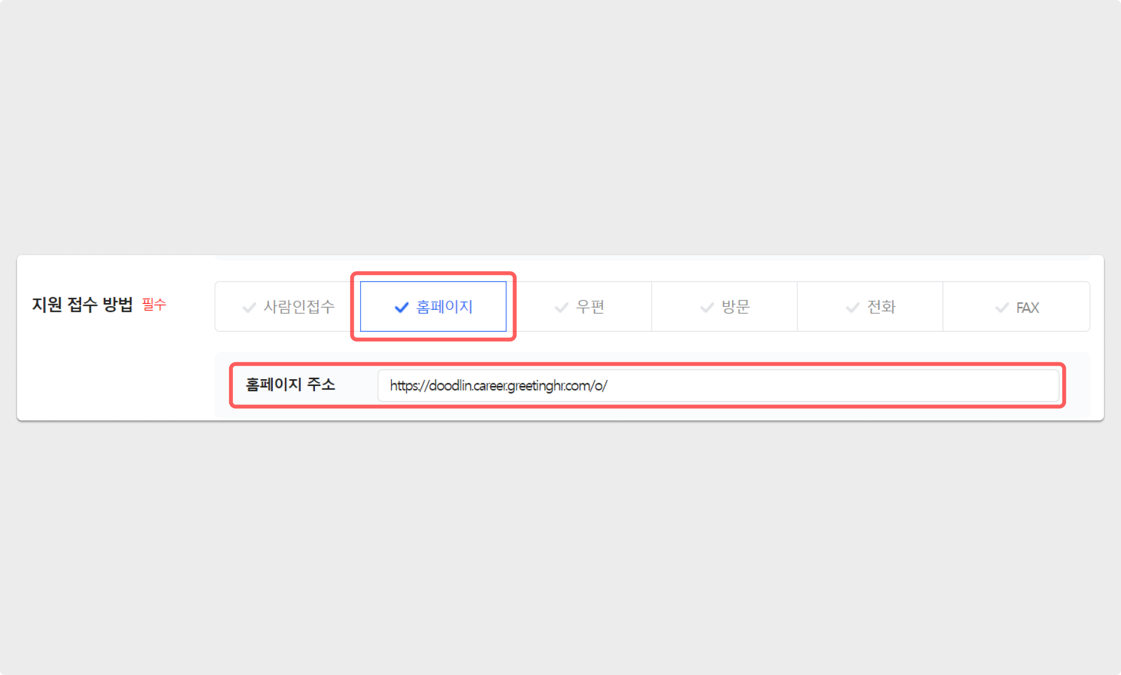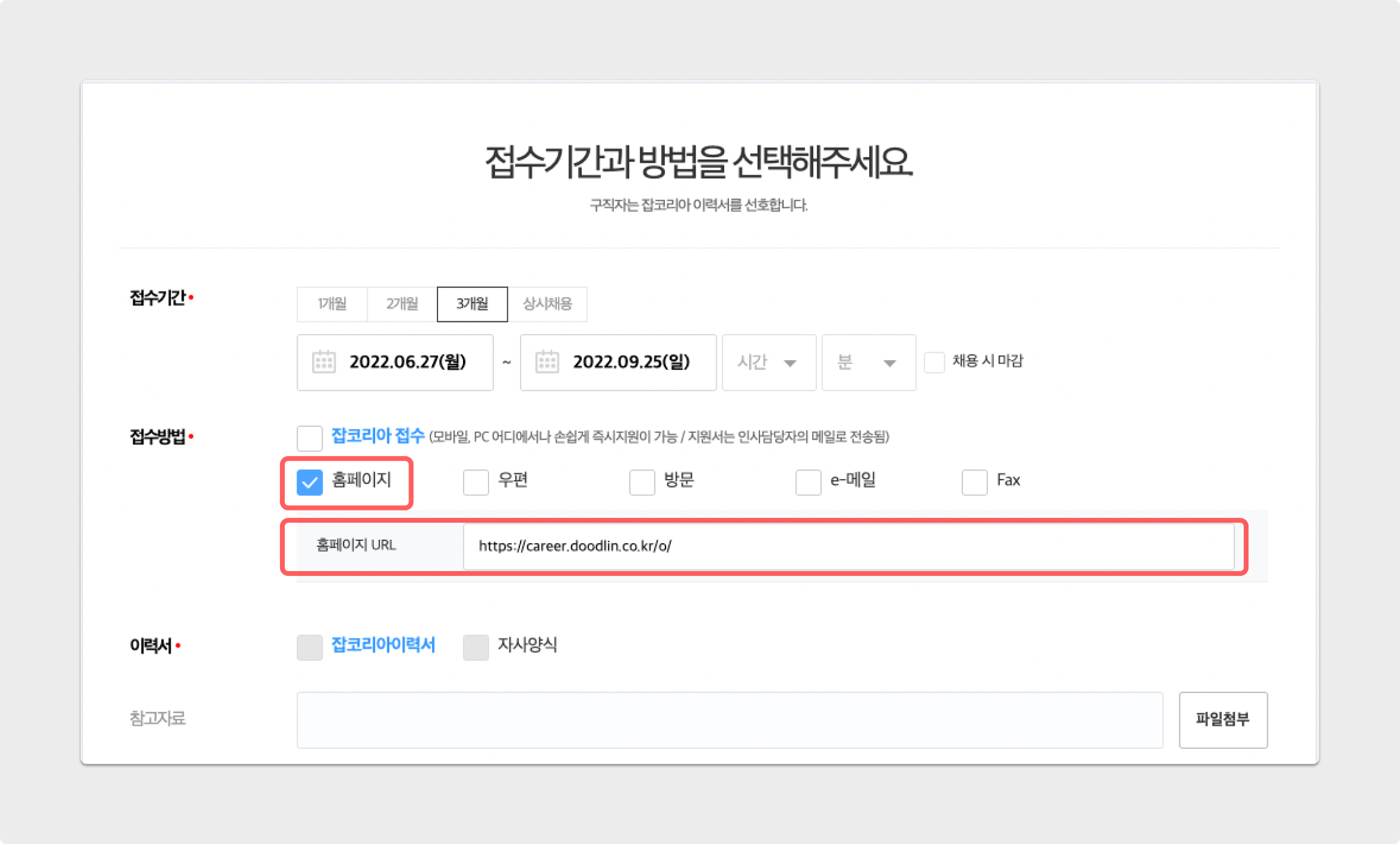 잡코리아에 기업 회원 로그인 후, 공고를 생성하는 과정에서 접수 방법을 홈페이지만 활성화하며 그리팅 공고 링크를 입력해 주세요.