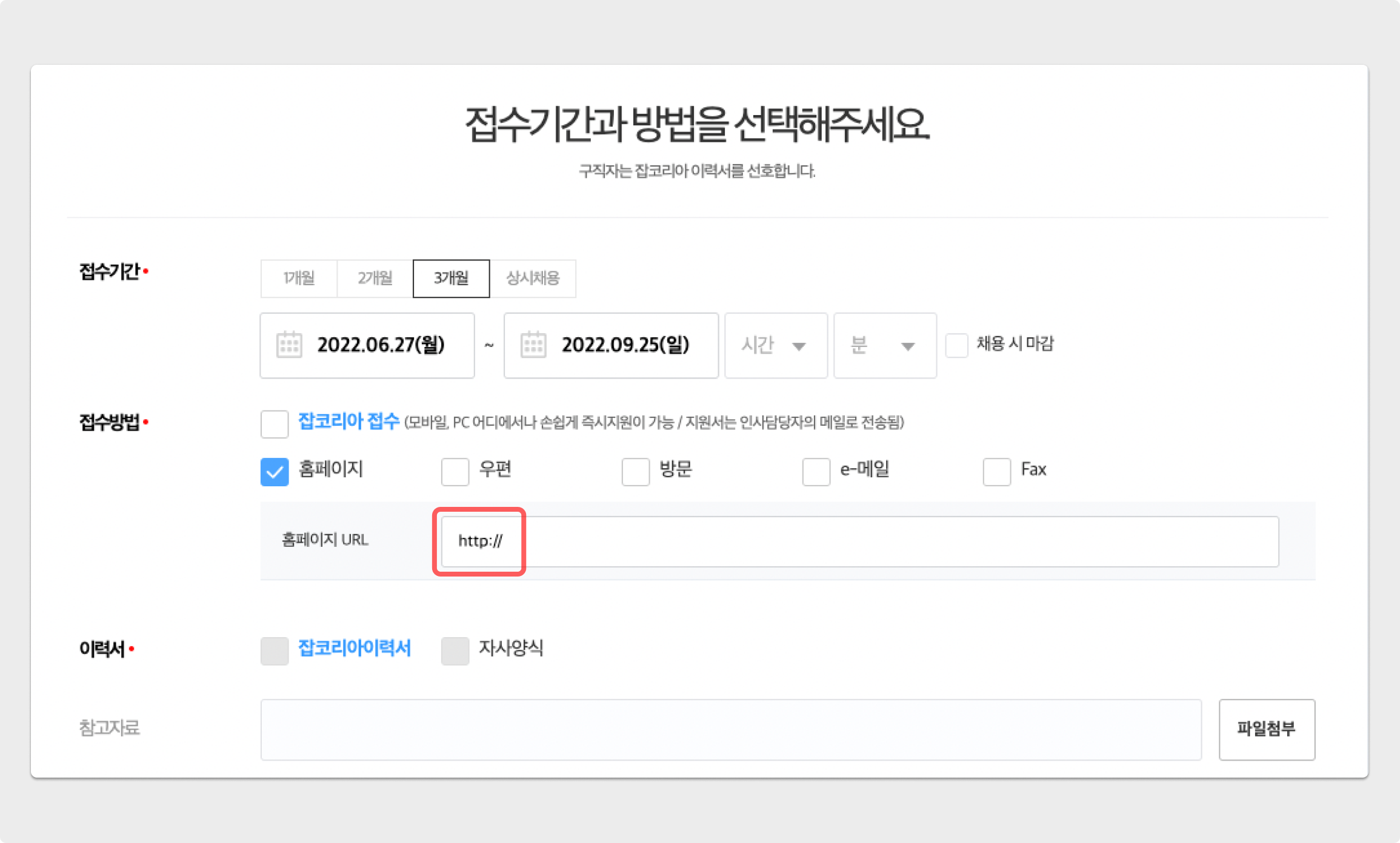 접수방법 중 > 접수방법를 활성화하면, 아래 이미지와 같이 URL 입력란에 'http://'이 기본으로 기재되어 있습니다.
