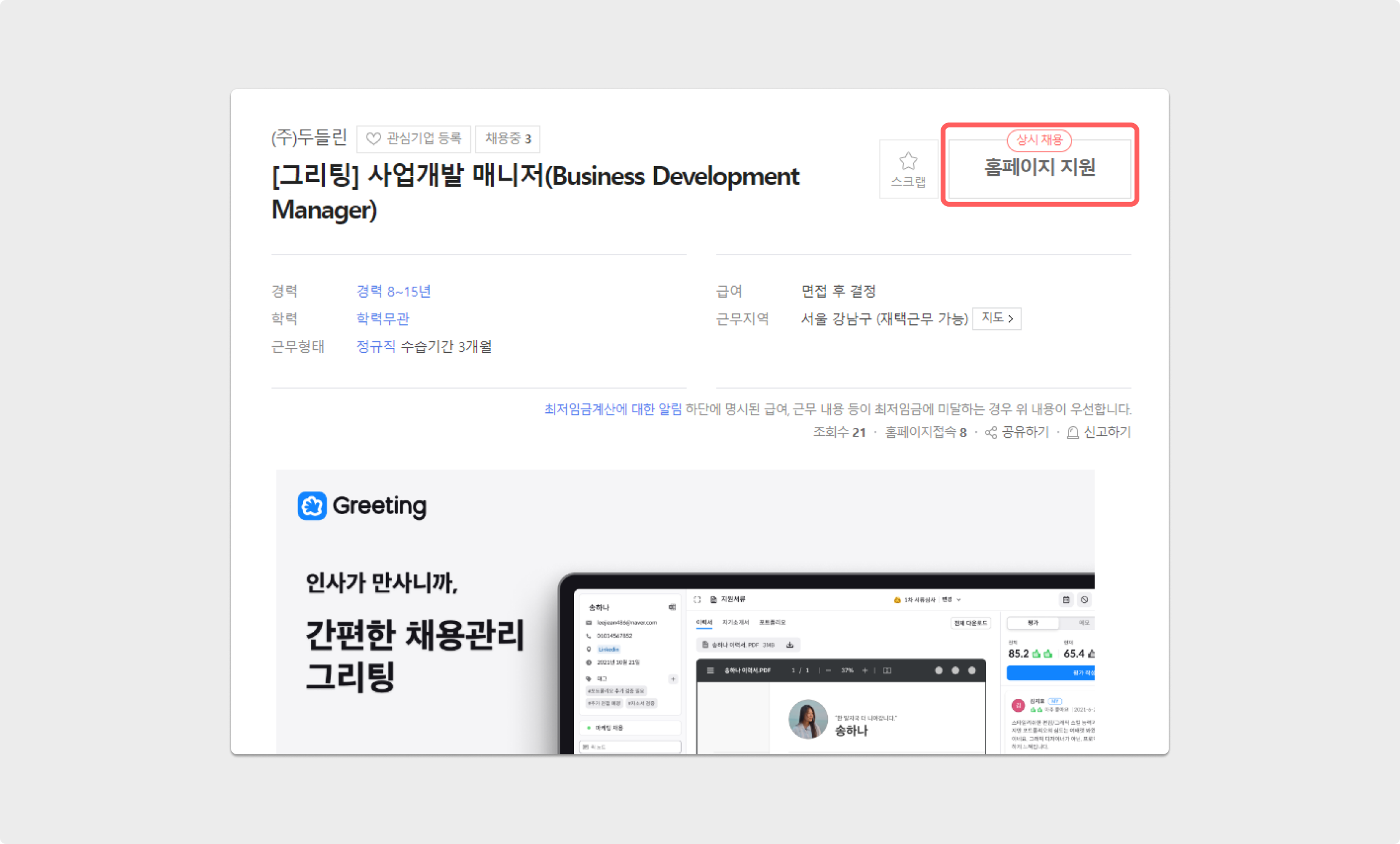 이후, 사람인 공고에서 홈페이지 지원 버튼으로 나타나게 되며, 지원자는 해당 버튼을 통해 그리팅 공고로 이동됩니다.