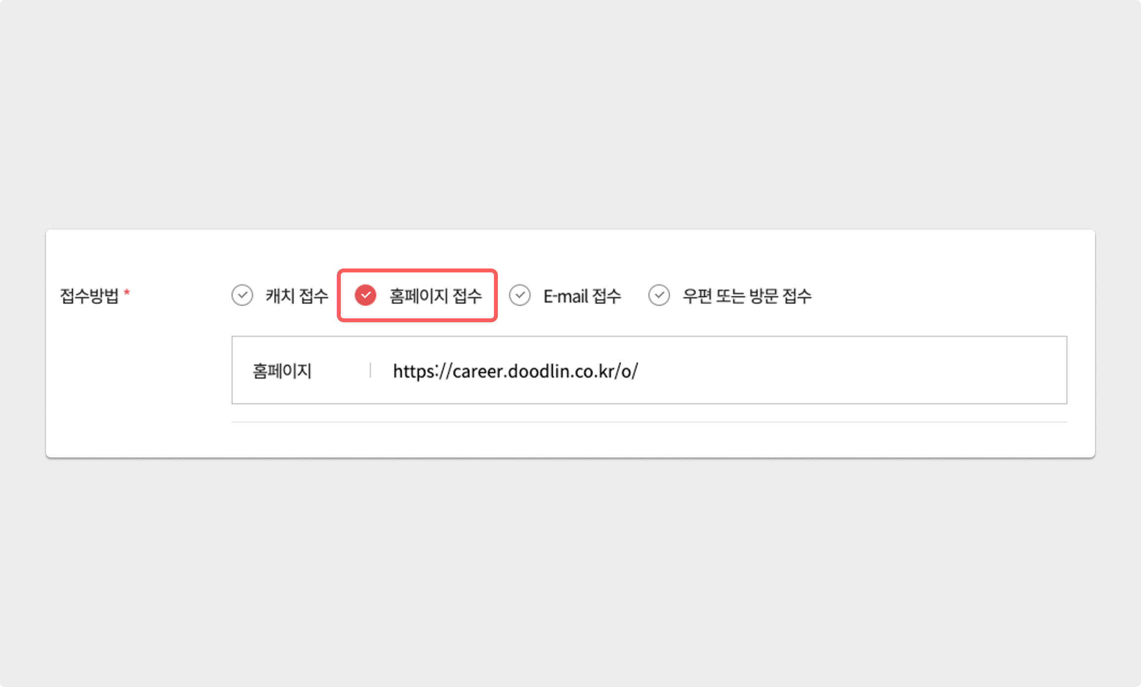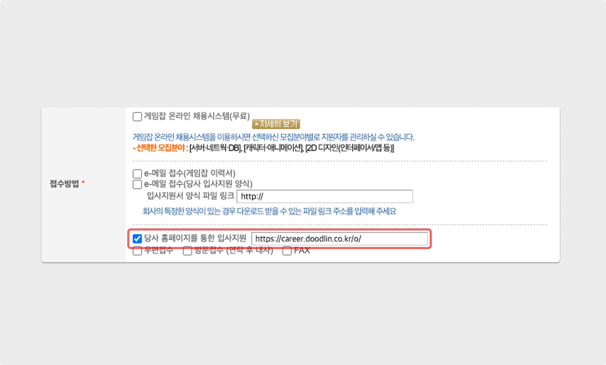 게임잡에 기업 서비스 로그인 후, 공고를 생성하는 과정에서 접수방법을 당사 홈페이지를 통한 입사 지원만 활성화해 그리팅 공고 링크를 입력해 주세요.