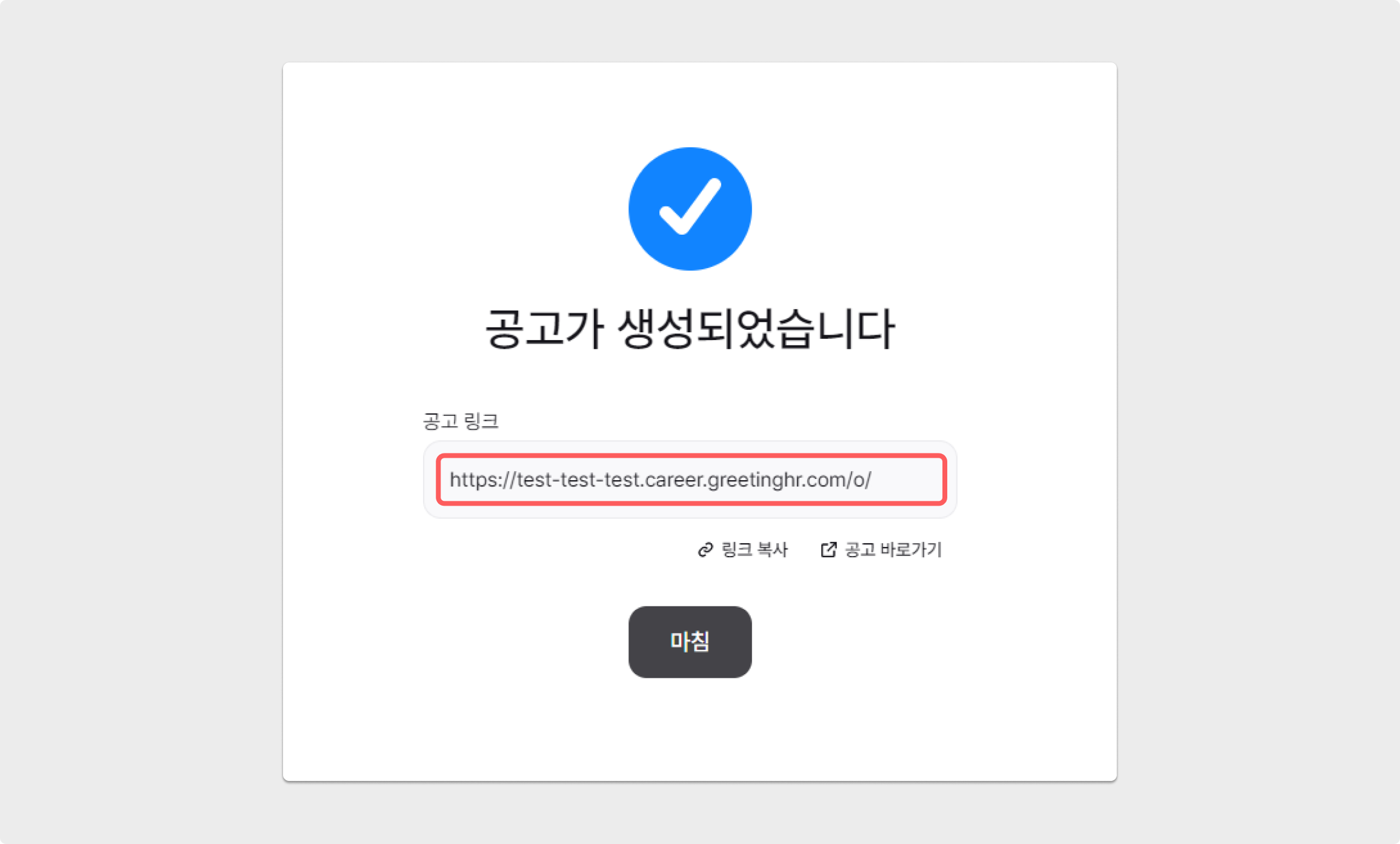 피플앤잡에 로그인 후, 공고를 생성하는 과정에서 접수방법을 홈페이지만 활성화해 그리팅 공고 링크를 입력해 주세요.