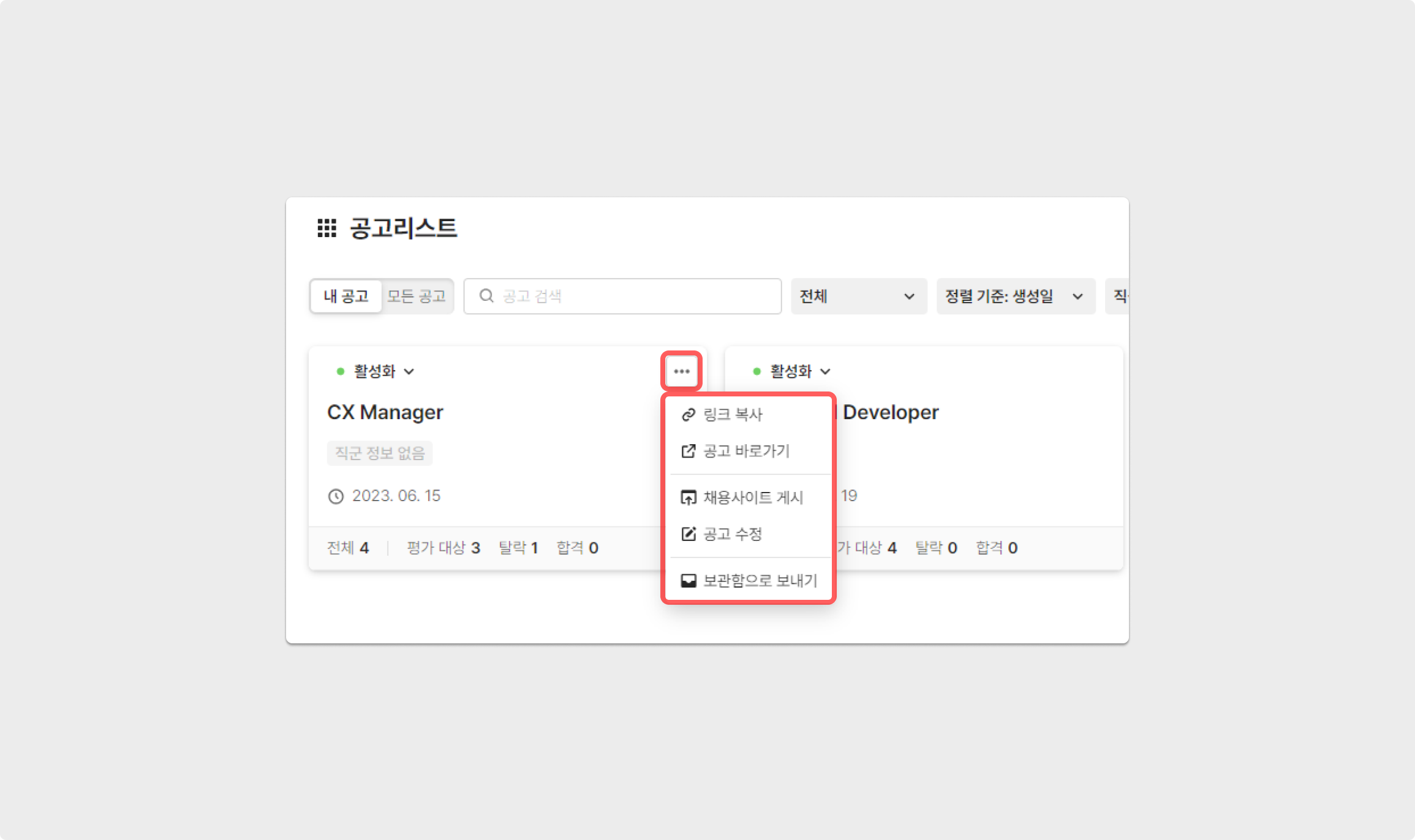 공고를 생성하는 과정이나 공고 리스트에서 각 공고 링크를 확인할 수 있습니다. 해당 링크를 각 채용 플랫폼의 접수 지원장법 → 홈페이지 지원에 입력해 주세요.