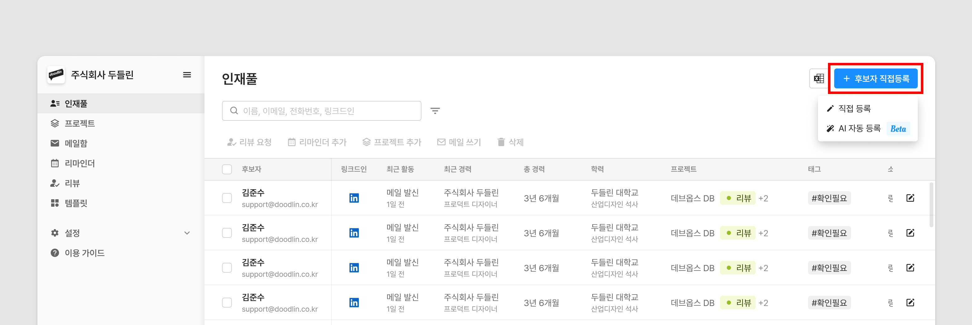 후보자의 이력서를 업로드하면 AI 분석을 통해 이력서의 정보를 자동으로 입력하여 등록합니다.