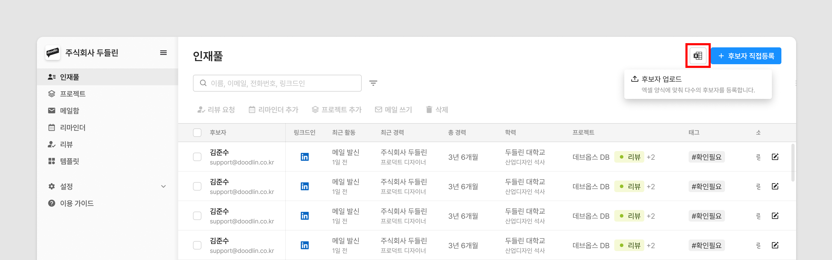 인재풀 또는 프로젝트 내부에서 엑셀 양식을 다운받아 다수의 후보자 등록이 가능합니다. 우선, 화면 우측 상단의 '엑셀 아이콘 > 후보자 업로드' 버튼을 클릭해 주세요.