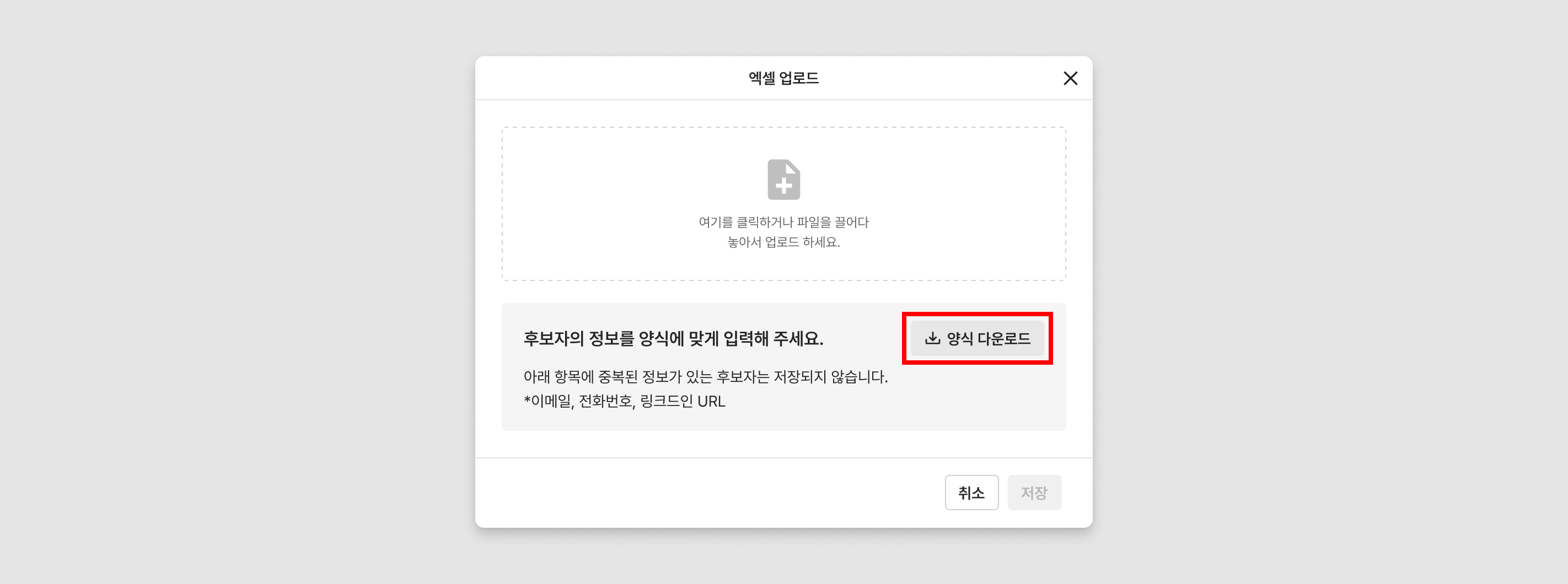 위 순서대로 파일을 업로드했다면 '저장' 버튼을 클릭해 후보자 등록을 완료해 주세요. 후보자 수에 따라 최대 10분까지 소요될 수 있습니다.
