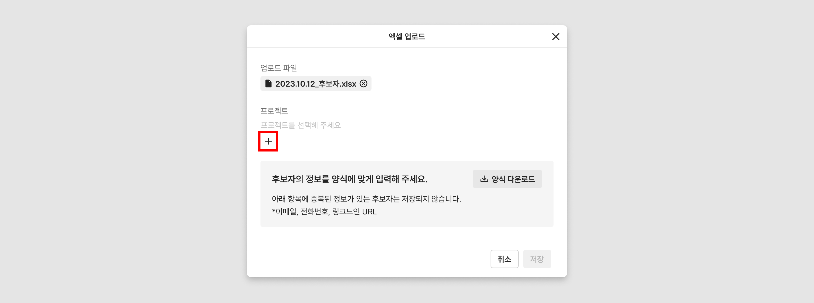 아래 이미지에 표시된 '+' 버튼을 클릭해 후보자들에게 프로젝트를 추가할 수 있으며, 프로젝트를 선택하지 않고 저장할 경우 인재풀에서만 확인이 가능합니다.
