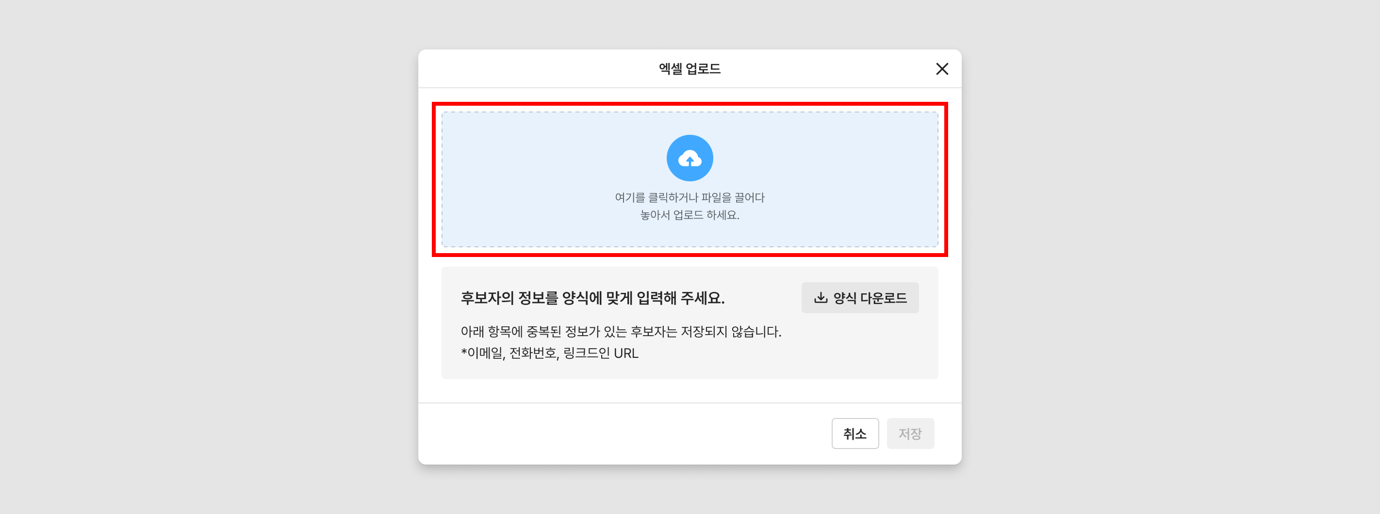 다운받은 양식에 맞춰 후보자 정보를 입력했다면, 아래 이미지에 표시된 영역을 클릭하거나 드래그해 파일을 업로드해 주세요.