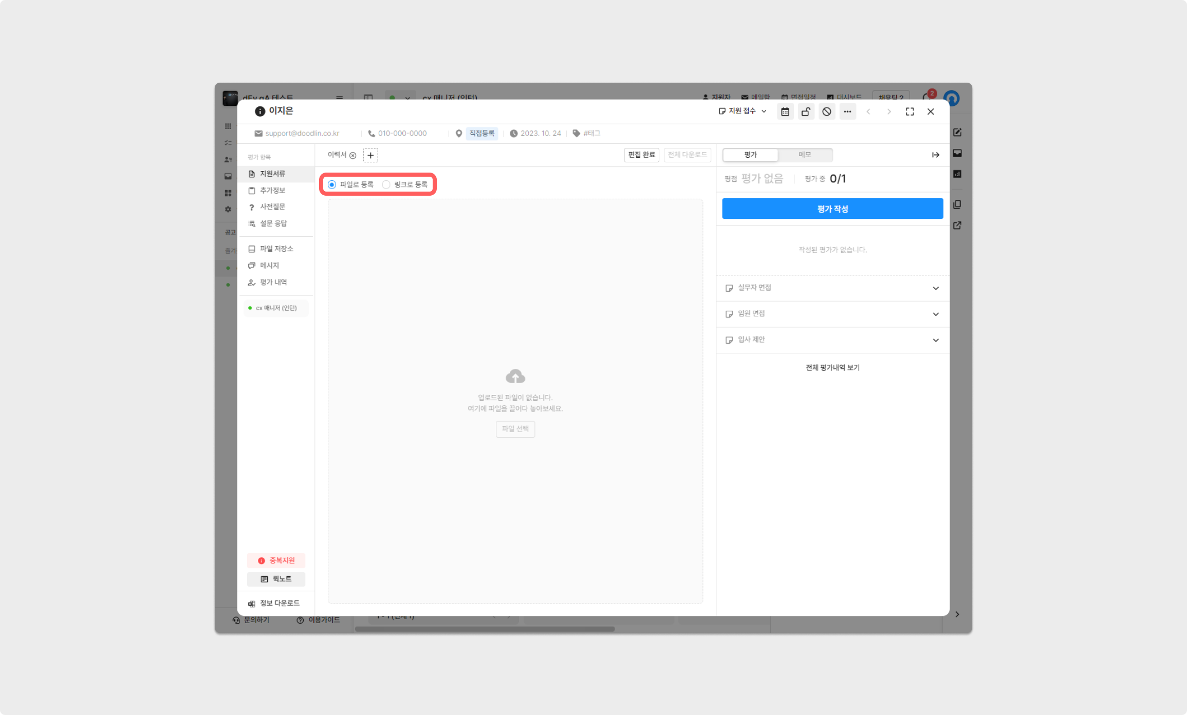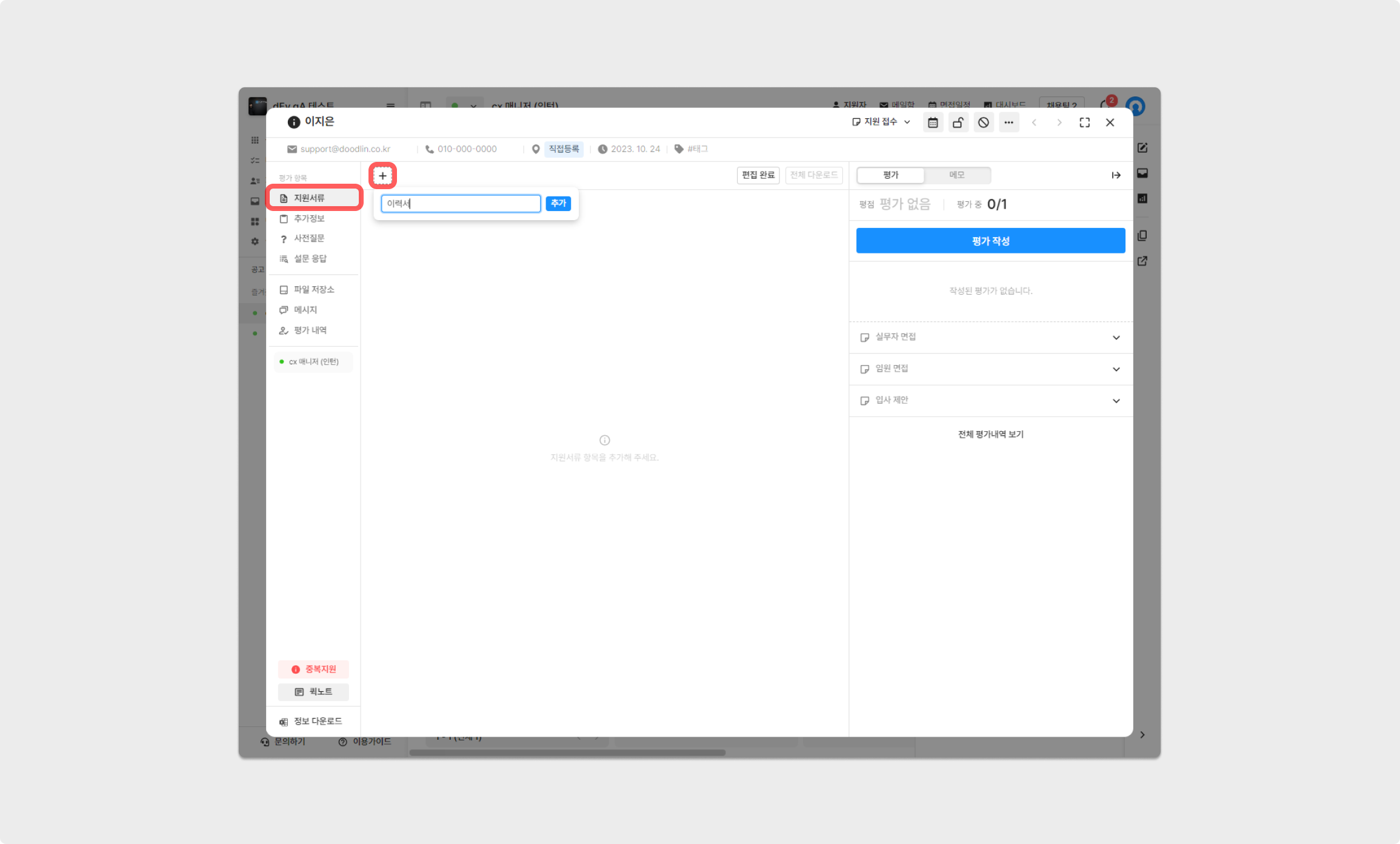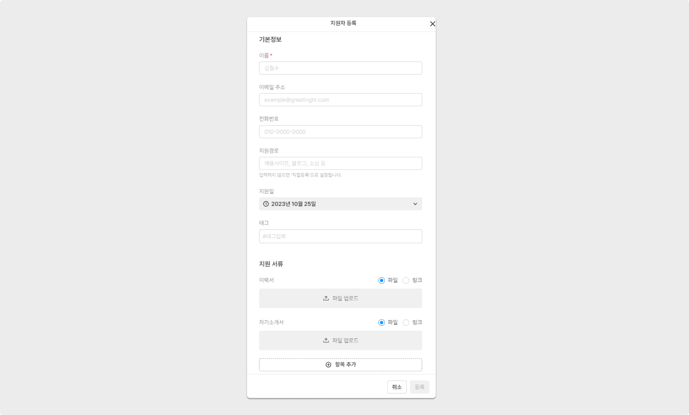 이후, 이름, 이메일 주소, 전화번호, 지원경로, 지원일, 태그를 입력할 수 있으며 지원자의 서류를 업로드할 수 있습니다. 서류는 파일 형식과 링크 형식을 제출할 수 있으며, 항목을 여럿 추가하며 이용할 수 있습니다.
