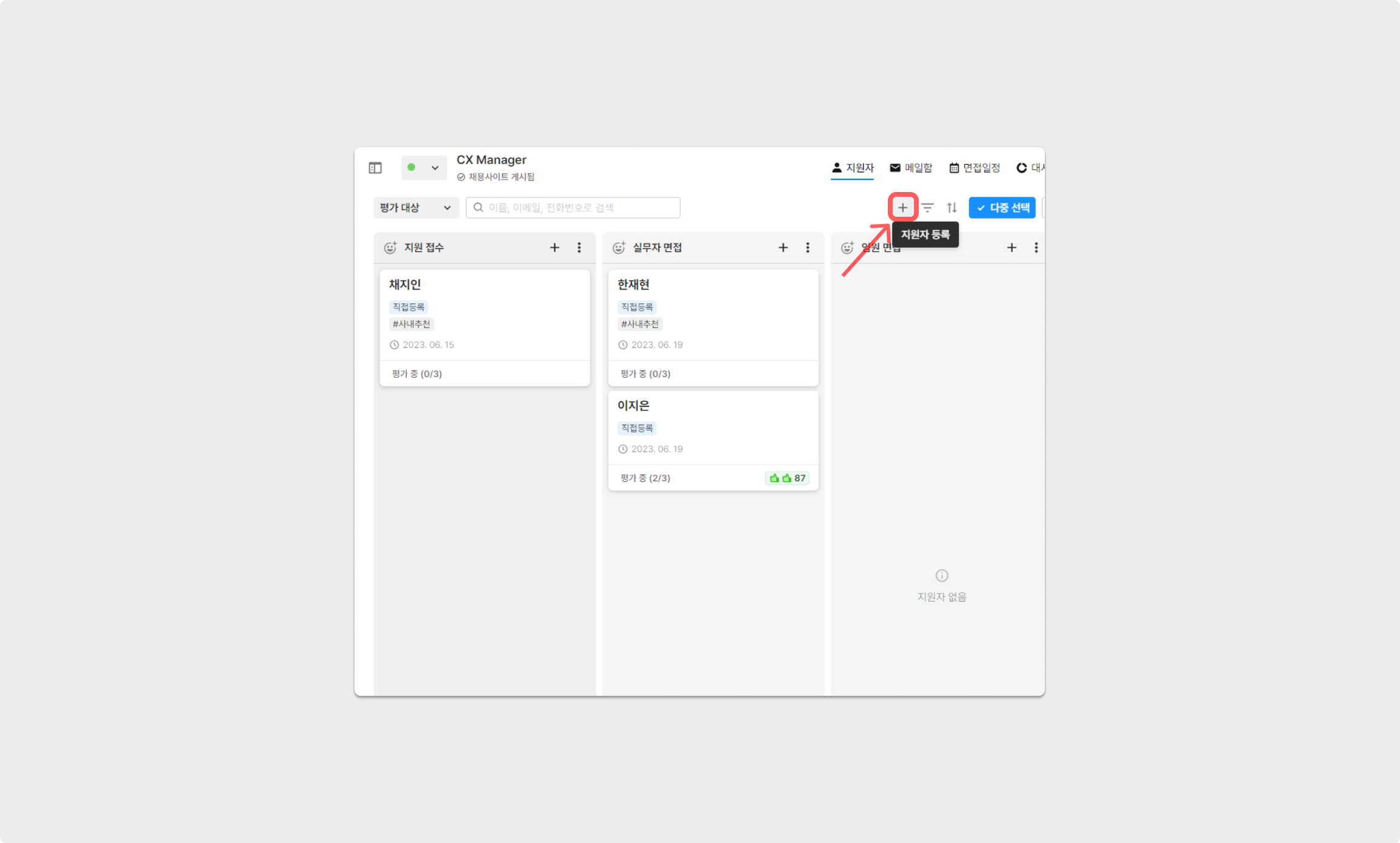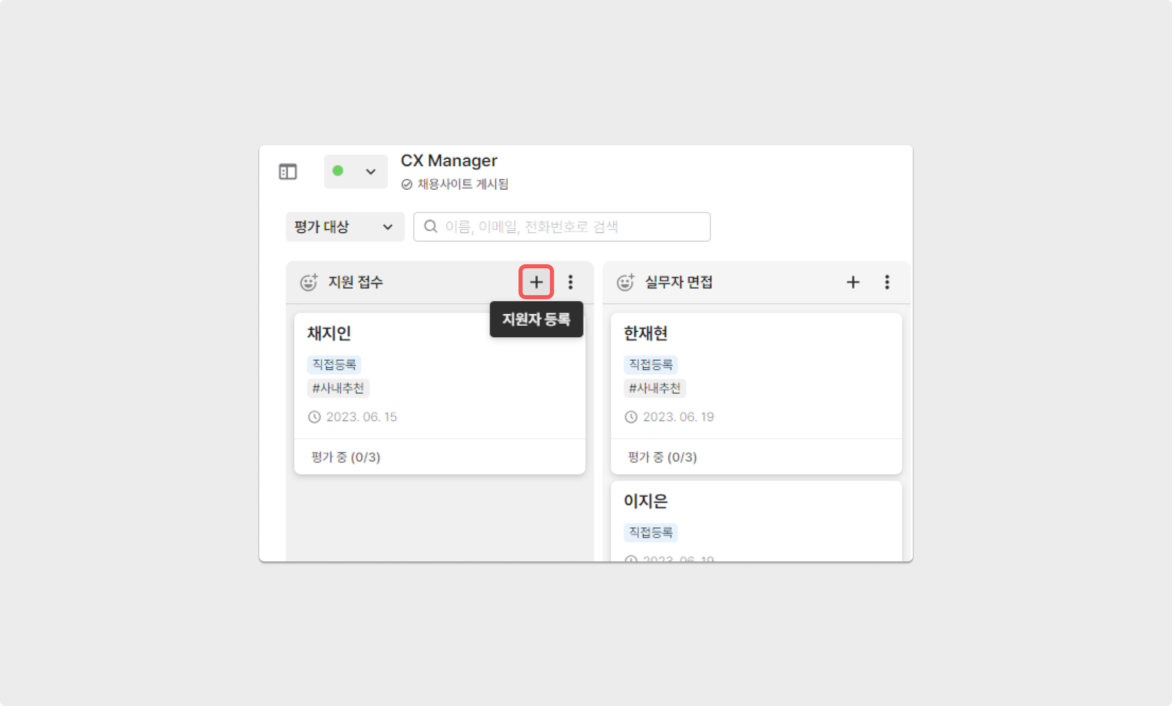 등록이 필요한 공고에 접속 후, 지원자를 등록할 채용 단계 내 지원자 직접등록 버튼을 클릭해주세요.