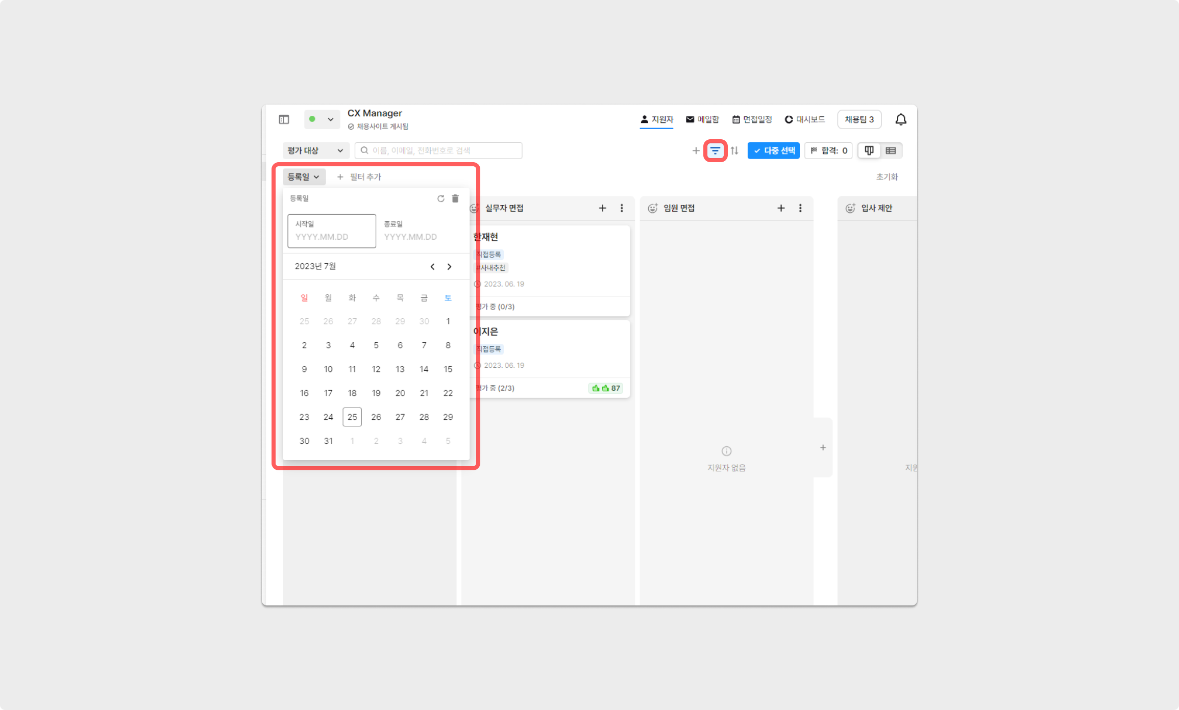 칸반 보드 형식/표 형식의 지원자 리스트 우측 상단에 위치한 '필터'를 이용하여 설정된 기간 내 등록된 지원자를 확인할 수 있습니다.