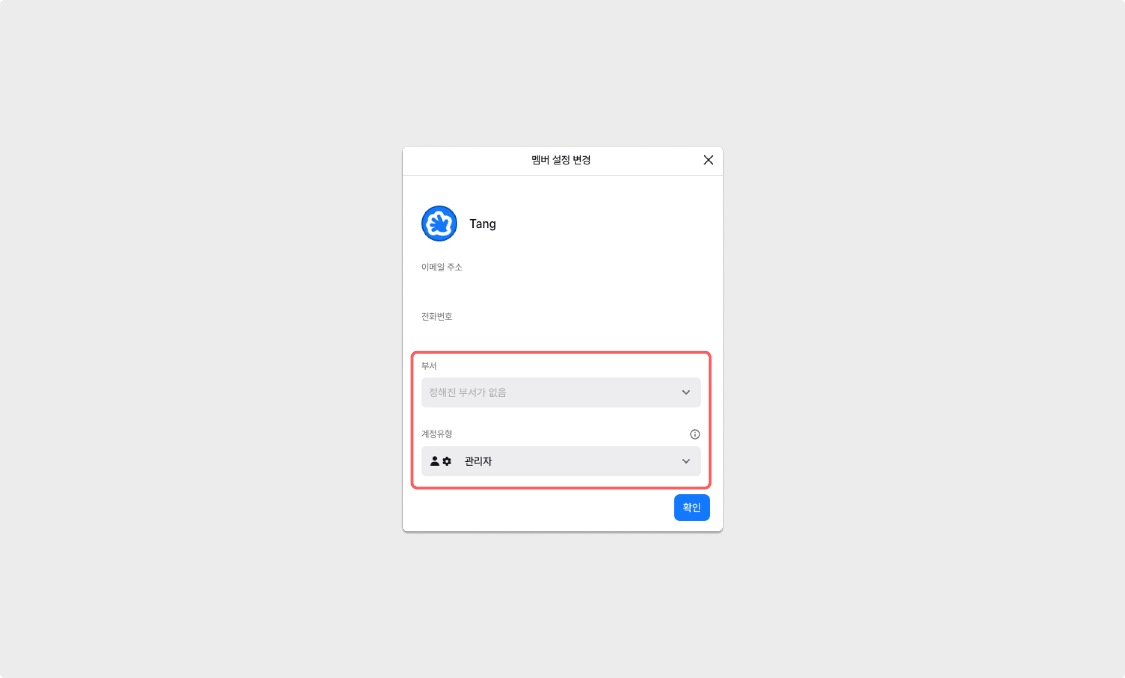 이후, [멤버 설정 변경]을 클릭하면 부서 및 워크스페이스 역할을 수정할 수 있는 창이 나타납니다.