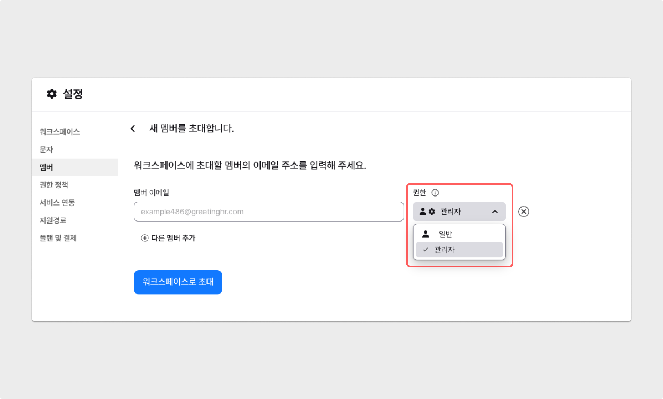 워크스페이스의 소유자 및 관리자 멤버가 [설정] → [멤버] → [+ 새 멤버 초대] 버튼을 통해, 초대할 멤버의 워크스페이스 역할을 사전에 설정할 수 있습니다.