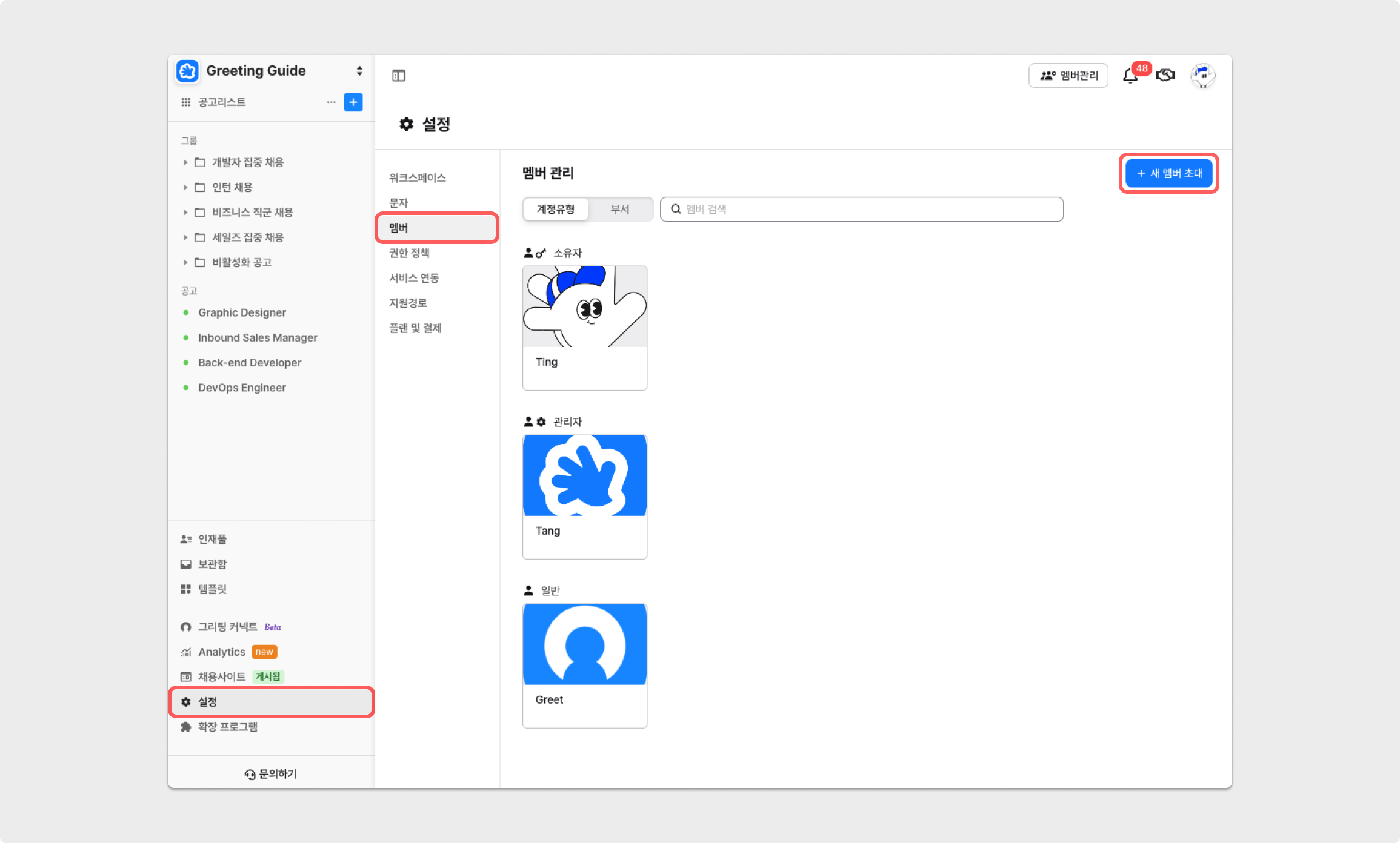 소유자: 관리자 및 일반 멤버 설정 변경 가능