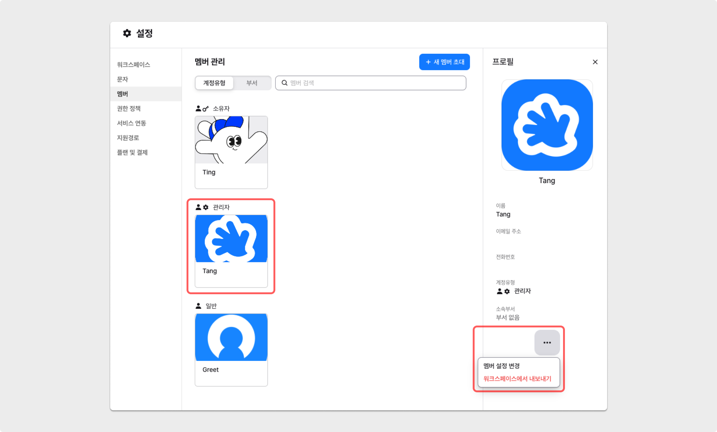 워크스페이스의 소유자 및 관리자 멤버가 [설정] → [멤버]에 접속한 후, 설정이 필요한 멤버를 클릭하여 [더보기] 버튼을 눌러주세요.