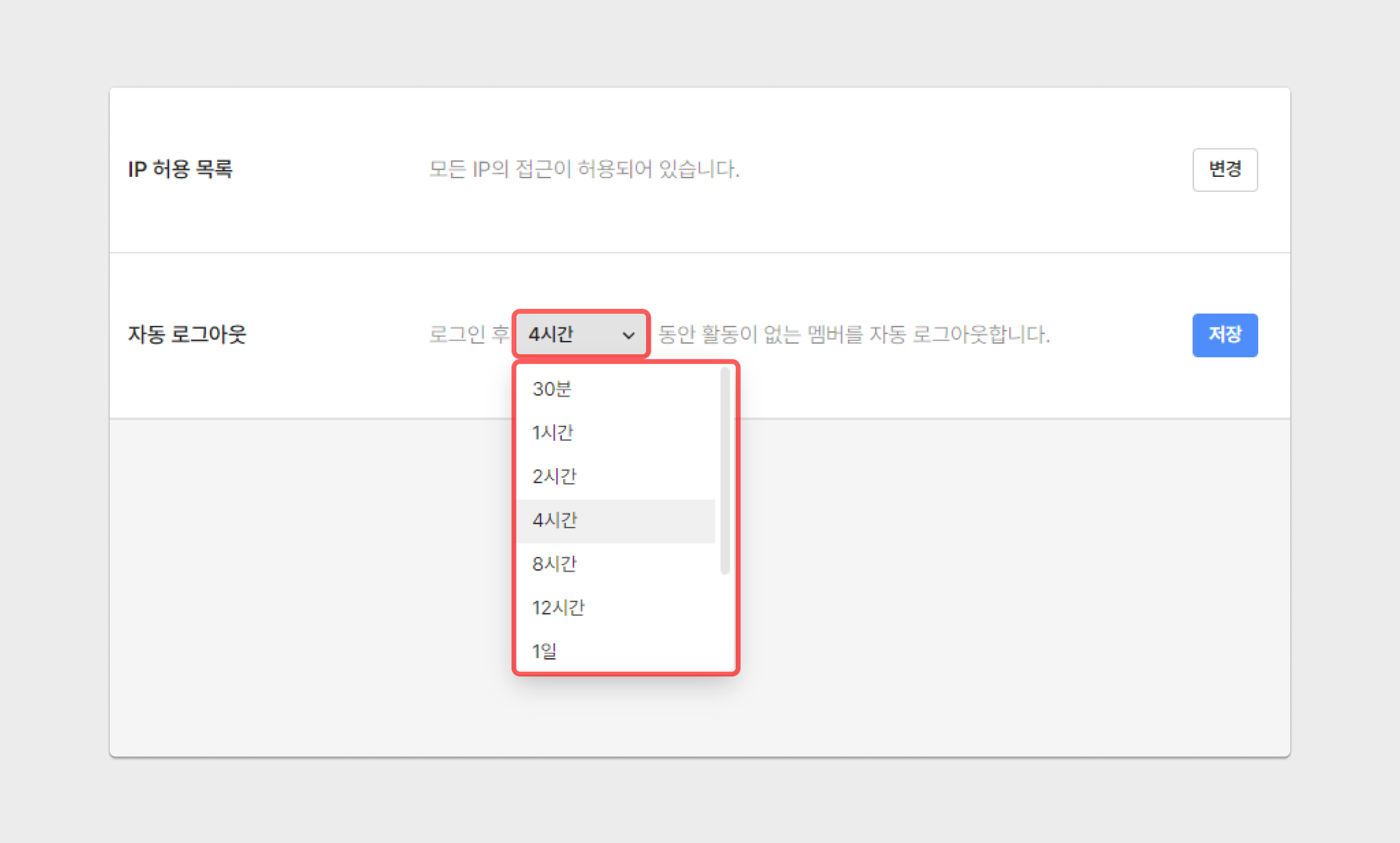 자동 로그아웃 설정은 최초 1회 로그아웃 및 재로그인 후 적용됩니다.