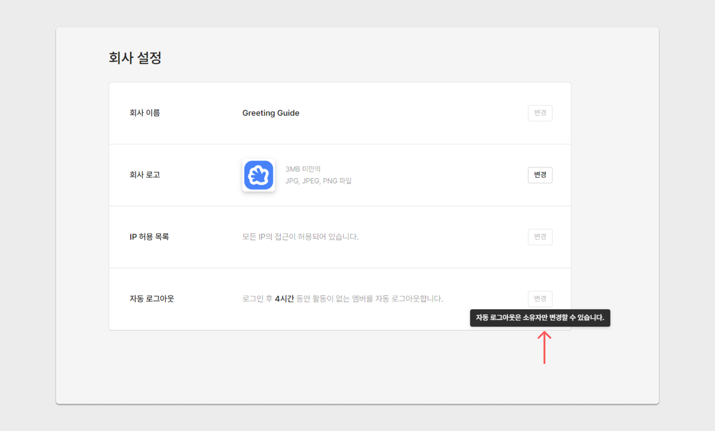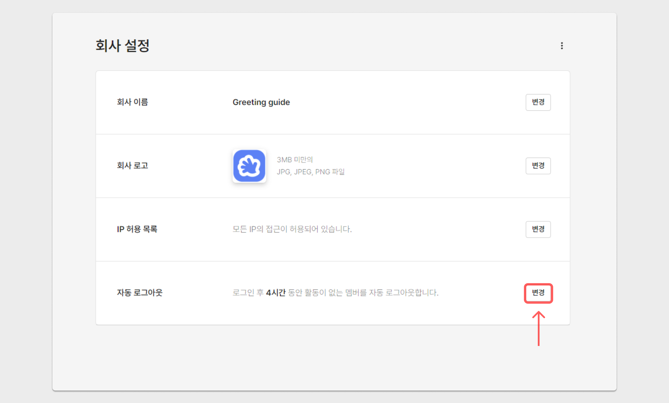 홈 화면에서 워크스페이스 소유자 멤버가 회사 설정 → 자동 로그아웃 → 변경 버튼을 통해, 최소 30분에서 최대 30일까지 로그인 만료 기간을 직접 설정할 수 있습니다.