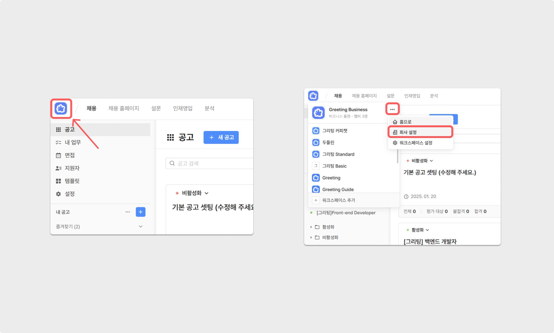 접근 방법 1: 워크스페이스 > 회사 설정