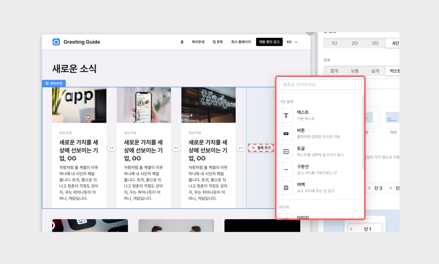 레이아웃은 '블록'을 생성하기 전 단계로서, 섹션의 층을 나누고 한 개의 레이아웃 내에서 단을 구분할 수 있습니다. 이후 각 단 안에서 블록을 추가하며 콘텐츠를 구성할 수 있습니다.