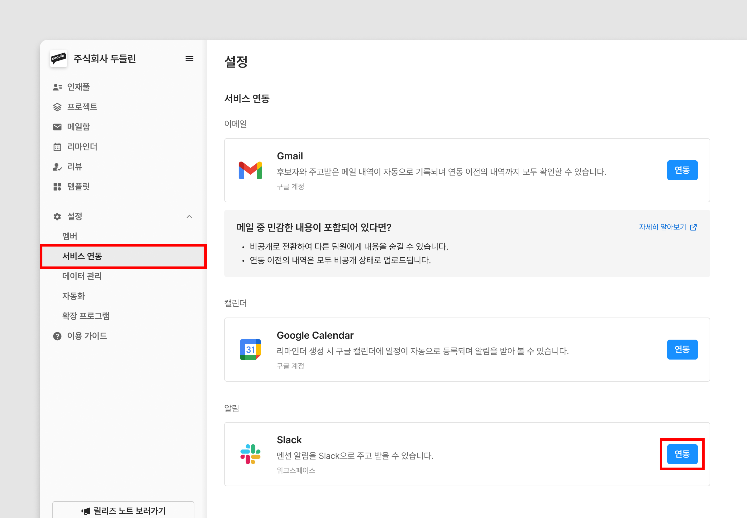 주요 기능Slack을 그리팅 TRM과 연동하는 것으로, 아래의 경우 알림을 수신할 수 있게 됩니다.내가 멘션된 경우 (활동 피드, 리뷰)나에게 리뷰 요청이 온 경우내가 요청한 리뷰가 완료된 경우연동 방법화면 좌측의 '설정 > 서비스 연동' 을 순서대로 접속해 주세요. 이후 Slack 카드의 '연동' 버튼을 클릭하여 연동을 완료할 수 있습니다.Slack 연동