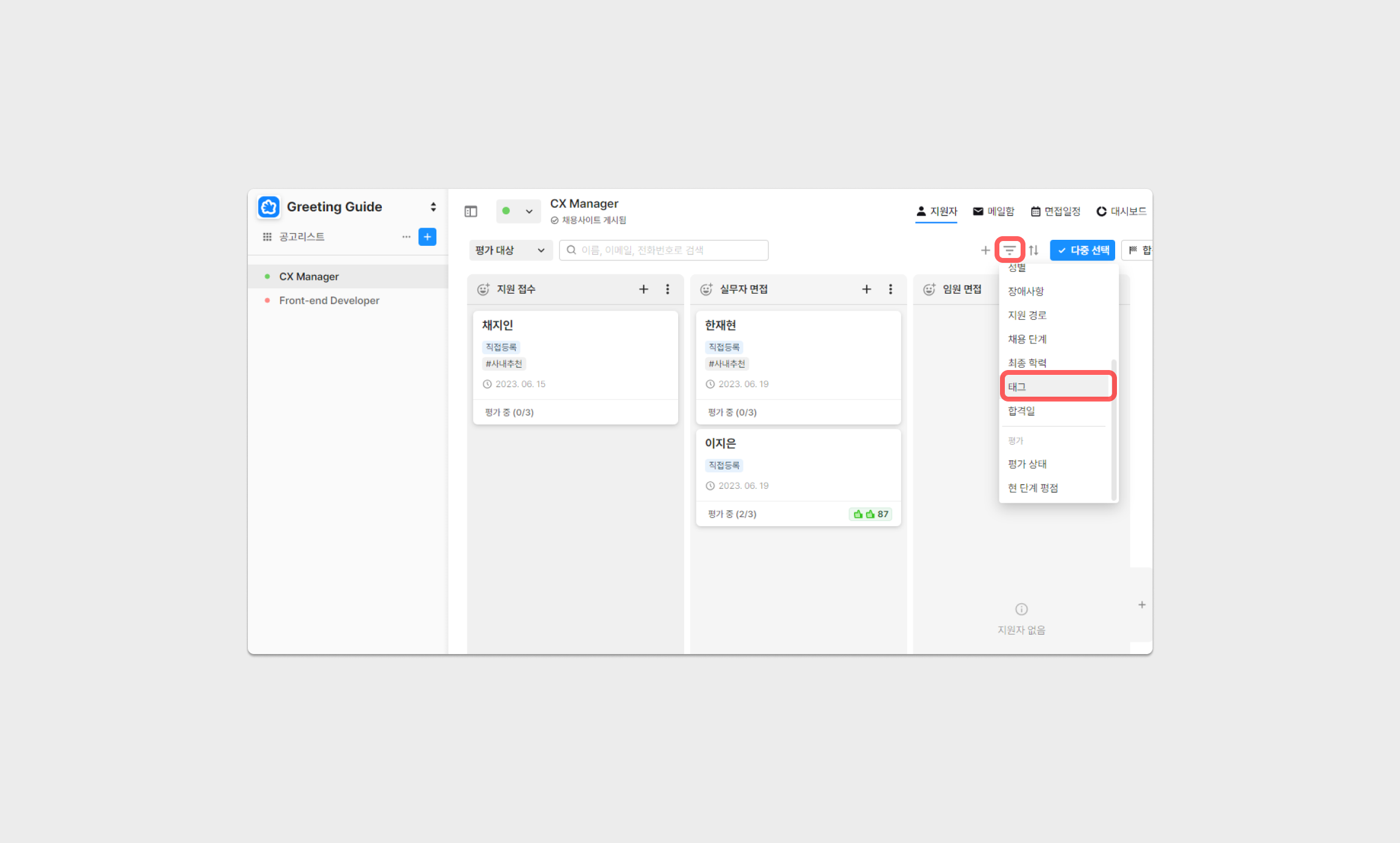 칸반 보드 형식/표 형식 우측 상단의 '필터'를 이용하여 태그가 설정된 지원자를 확인할 수 있습니다.