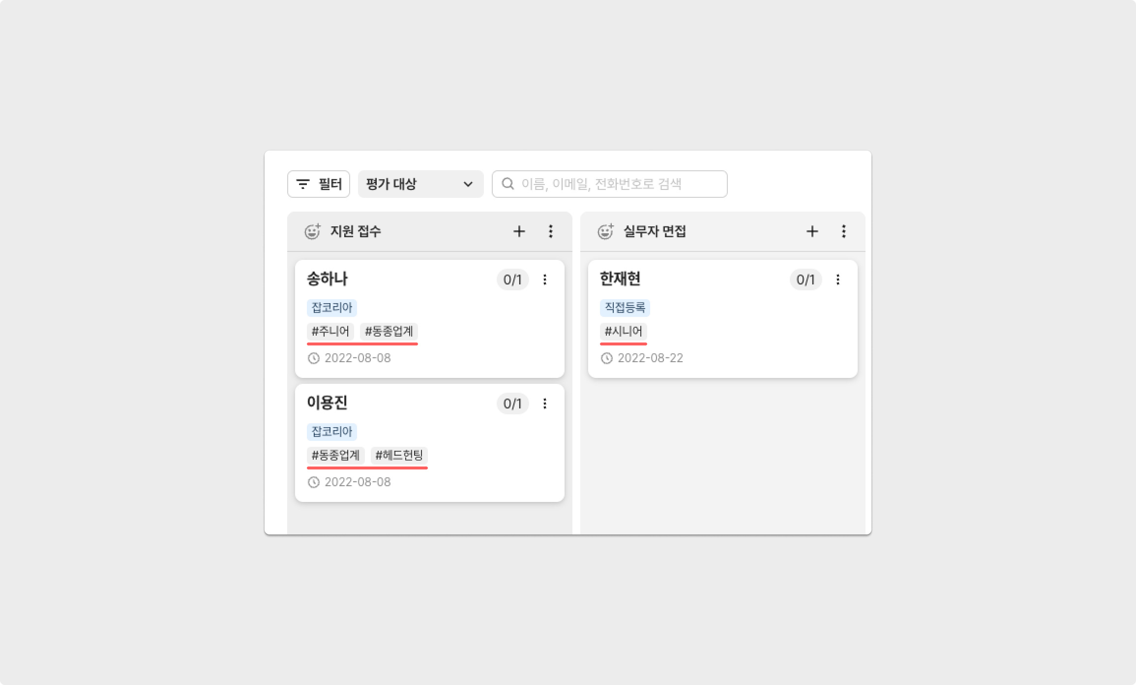 태깅 이후, 칸반 보드 형식/표 형식에서 아래 이미지와 같이 지원자 카드에 각 태그가 명시되어 나타납니다.