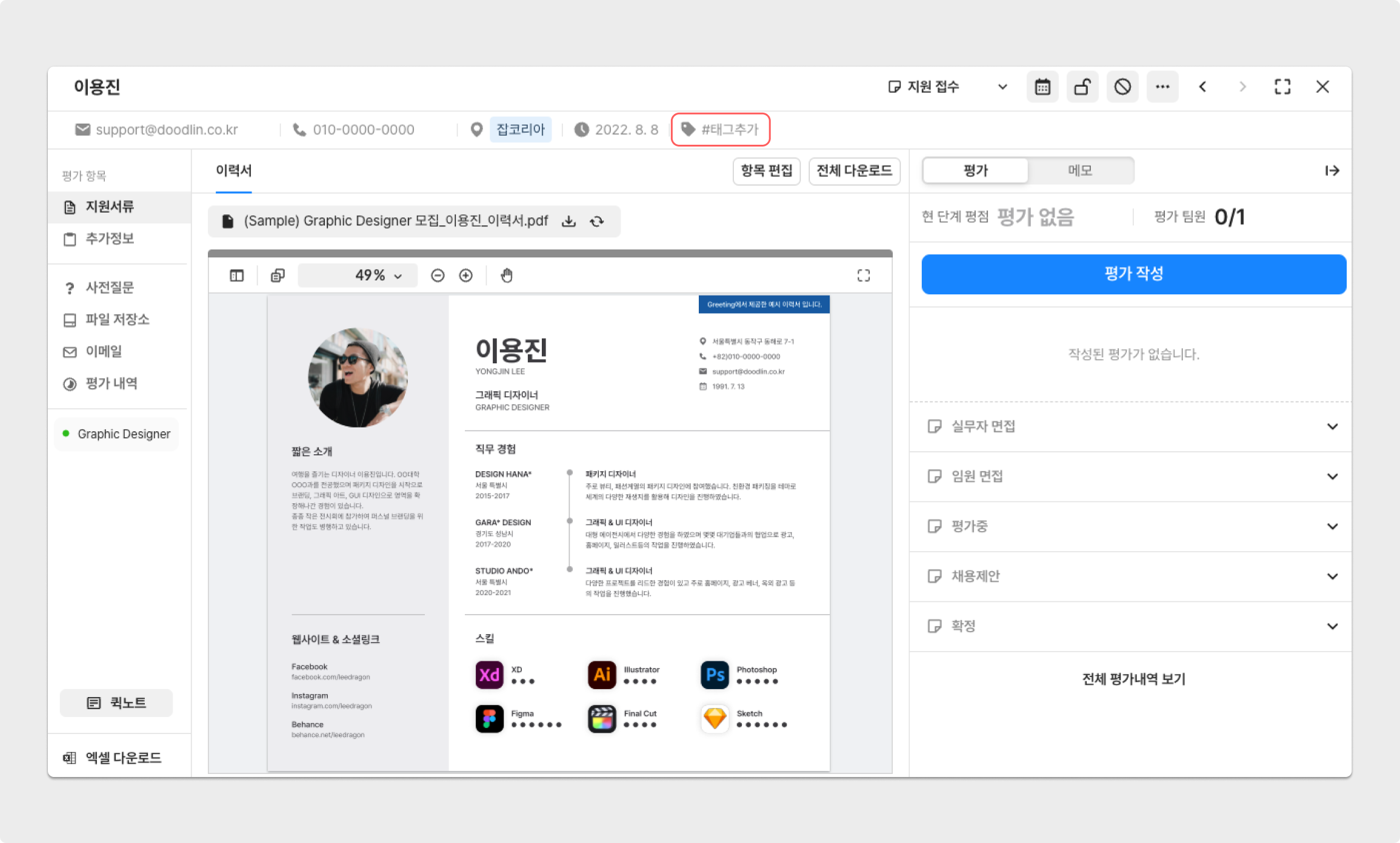 지원자 상세 페이지 내 [태그 추가] 버튼을 통해 태그를 설정할 수 있습니다.