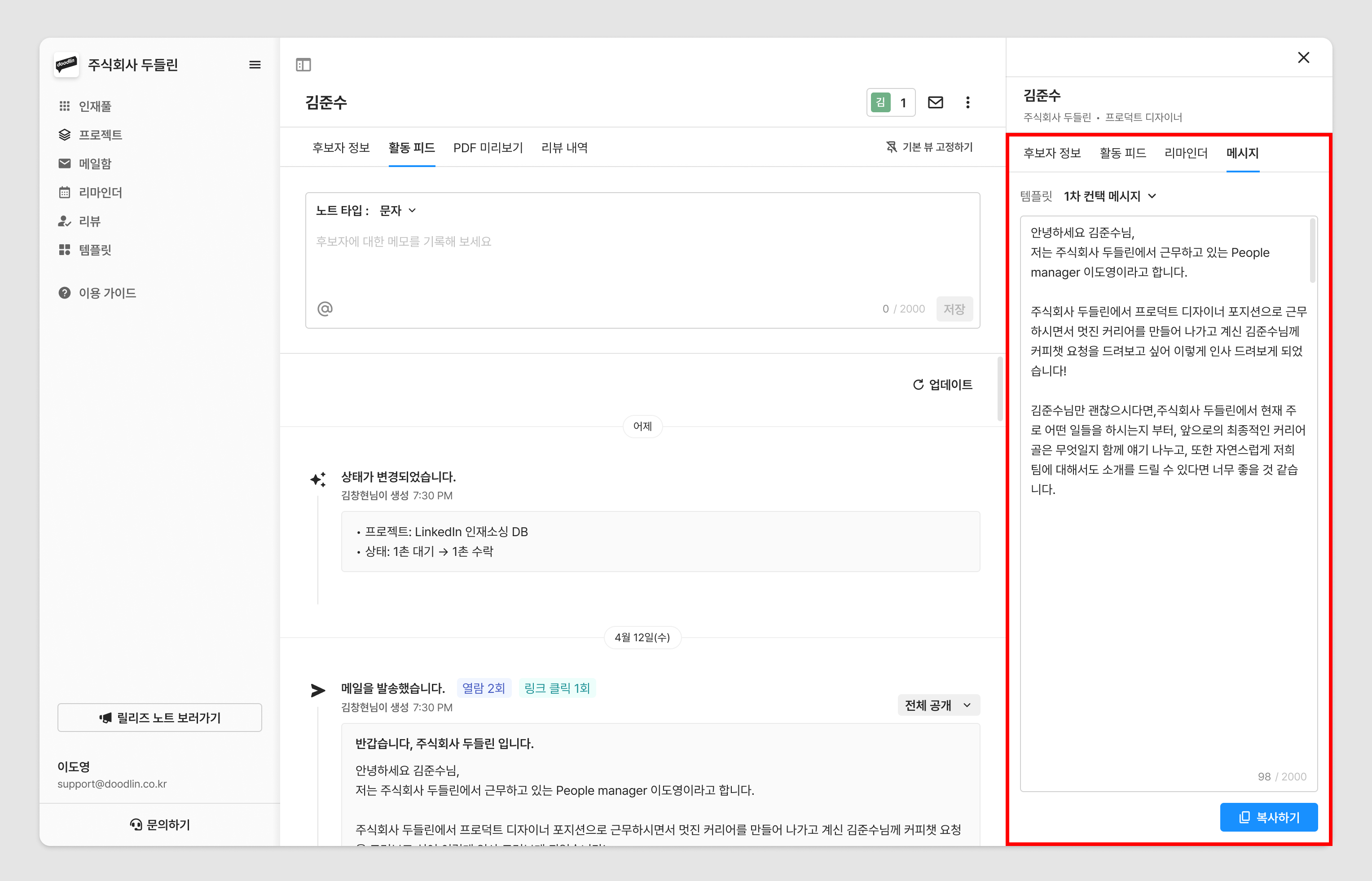 후보자 상세 화면에서 '우측 사이드 영역 > 메시지 탭'에서 템플릿을 불러올 수 있습니다. 템플릿의 내용은 해당 후보자의 정보에 맞게 변수를 대입해 불러와집니다.