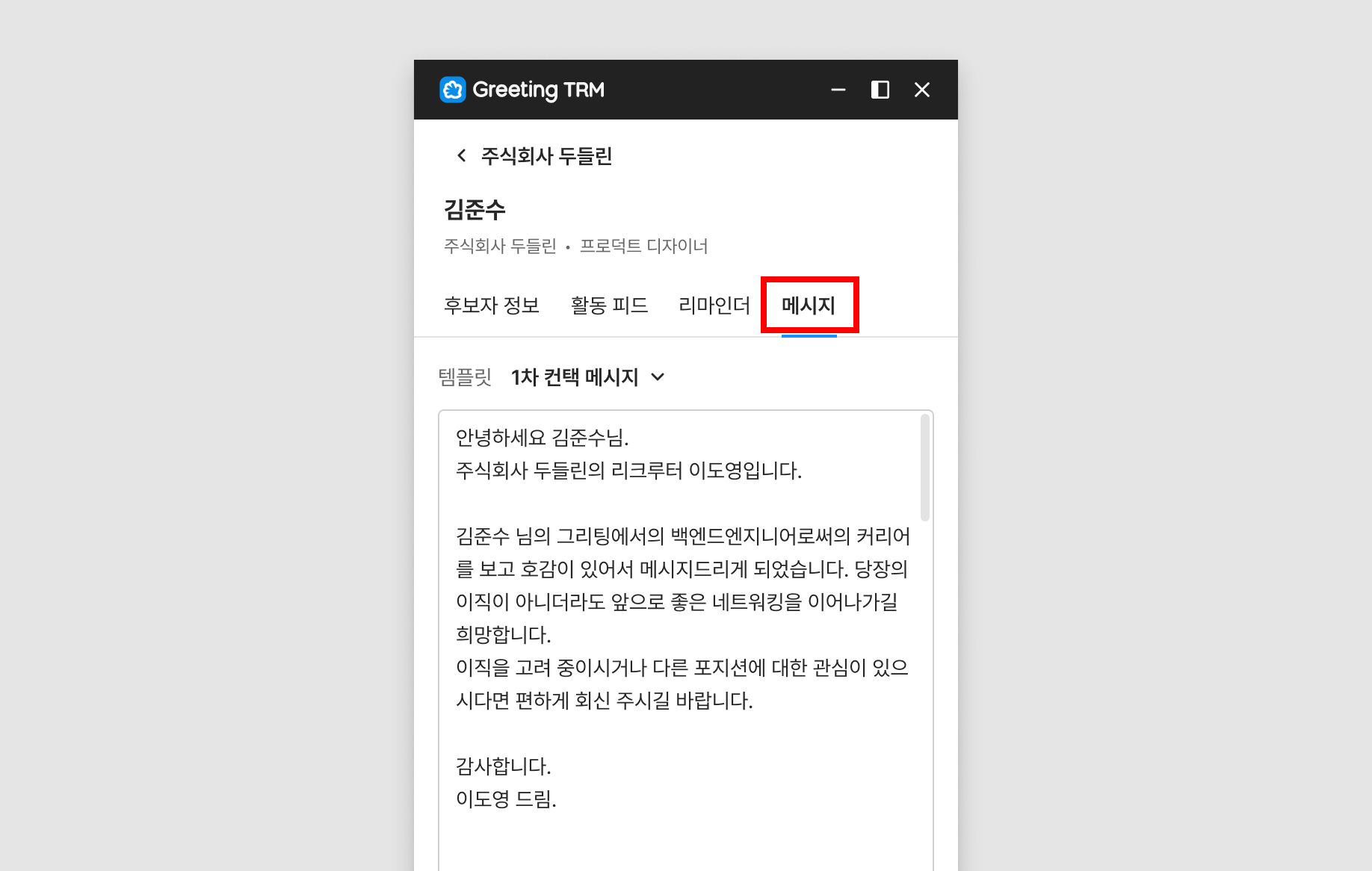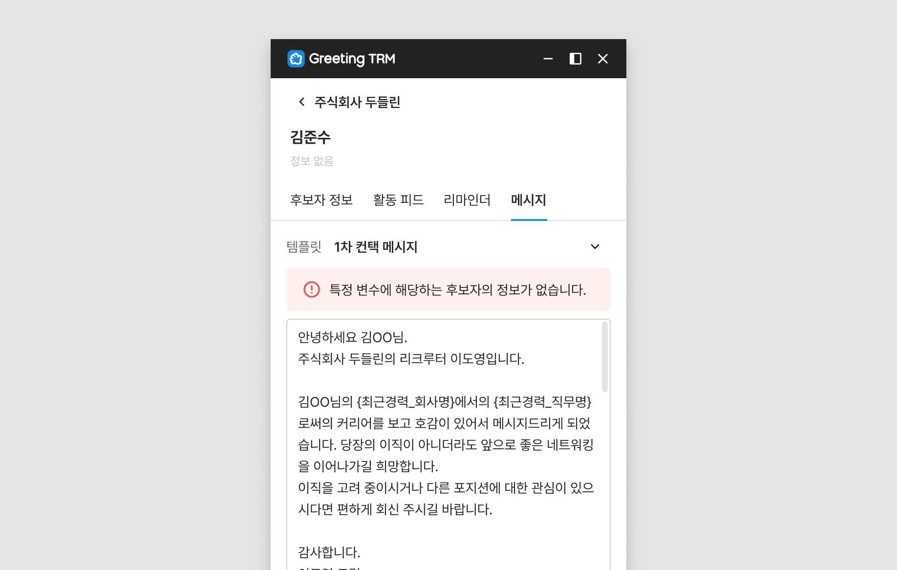 그리픽 for TRM (확장 프로그램)의 '메시지 탭'에서 템플릿을 불러올 수 있습니다. 템플릿의 내용은 해당 후보자의 정보에 맞게 변수를 대입해 불러와집니다.