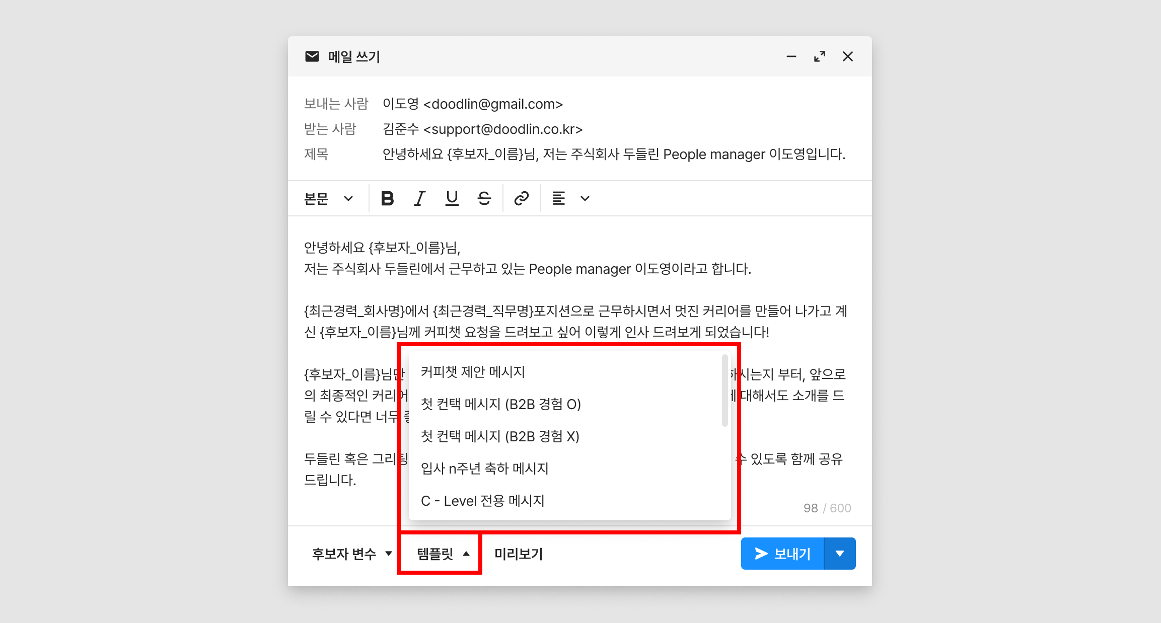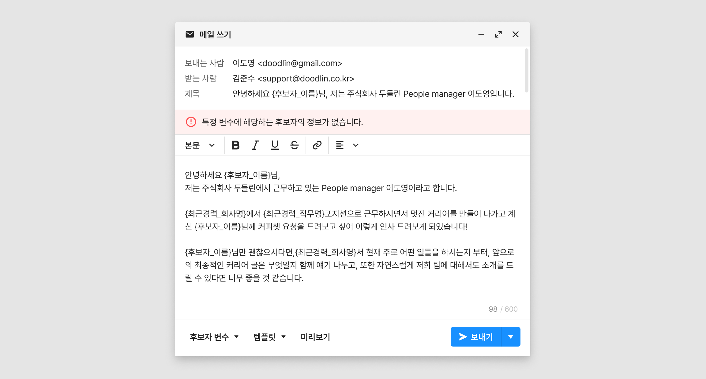 메일 작성 시에도 템플릿을 불러와 사용하실 수 있으며, 다수의 후보자에게 메일 작성 시 각 후보자의 정보에 맞춰 변수가 적용되어 보내집니다.
