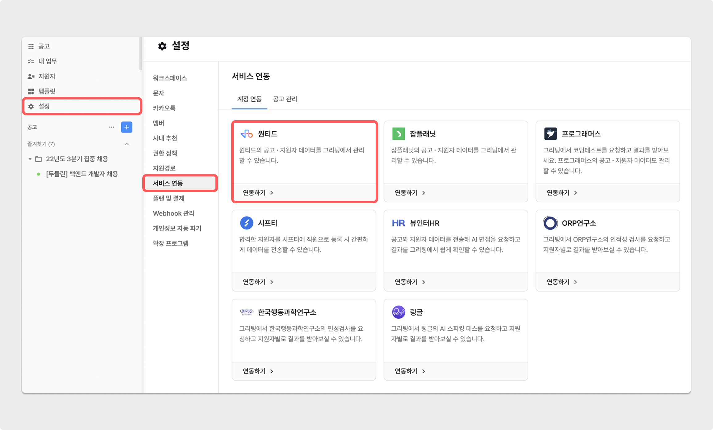 그리팅에서 설정 → 서비스 연동의 순서대로 접속한 후, 원티드 연동하기를 클릭해 주세요.