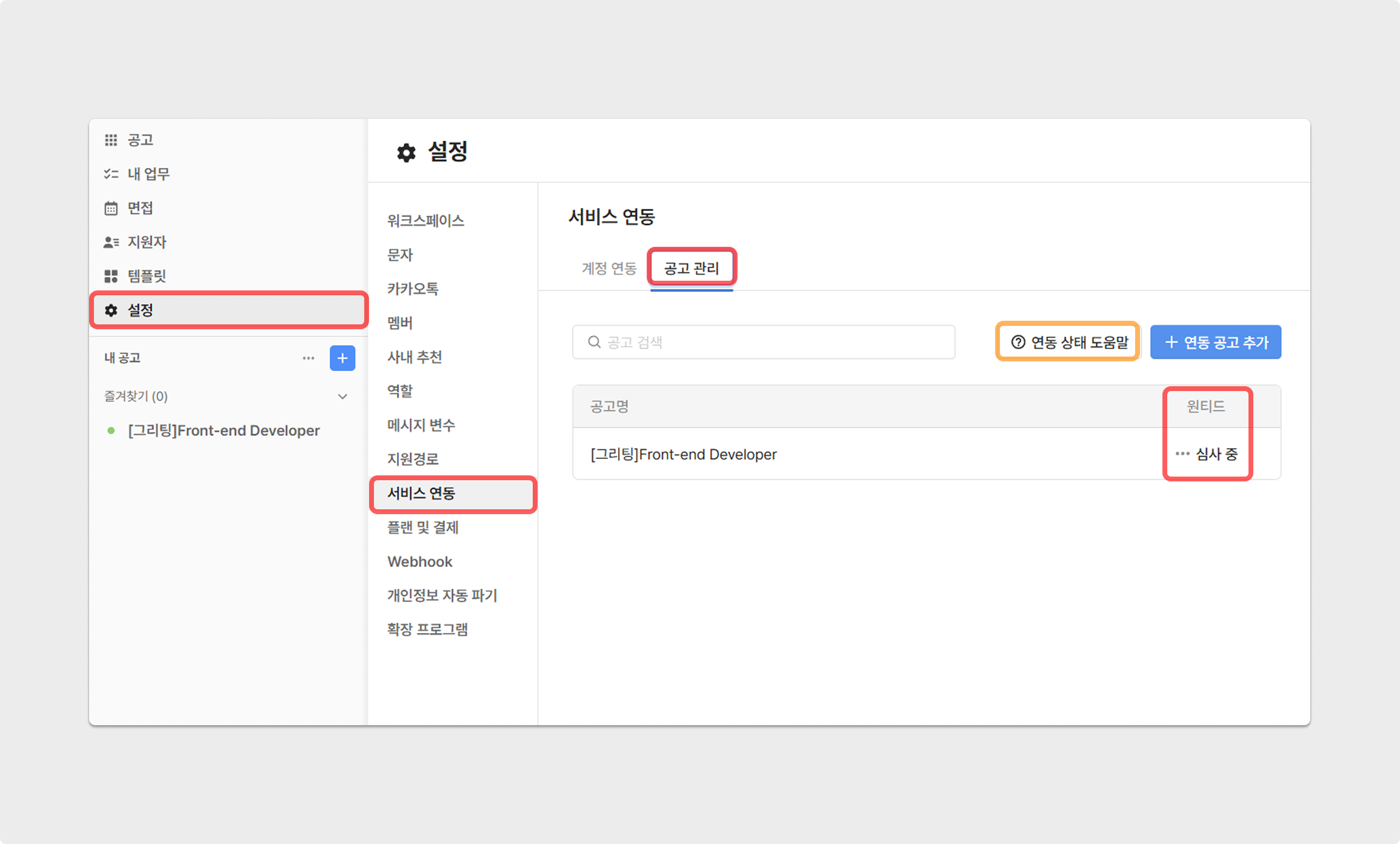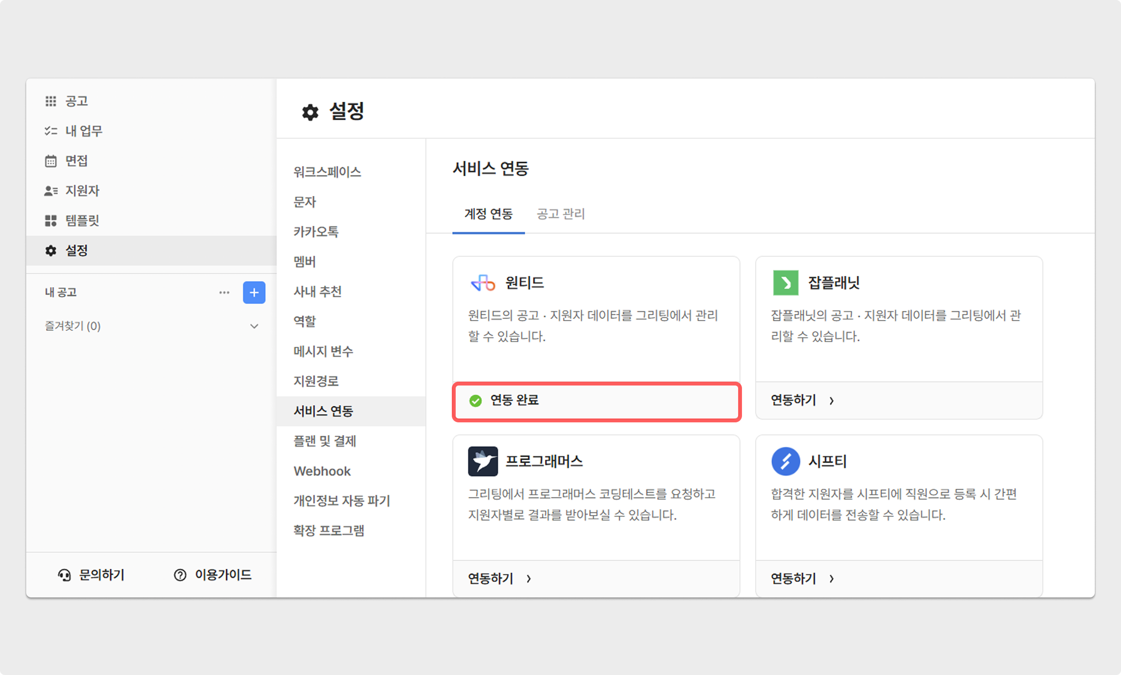 연동이 완료된 후 [설정]→[서비스 연동]→[공고 관리]에서 연동 상태를 확인할 수 있습니다.