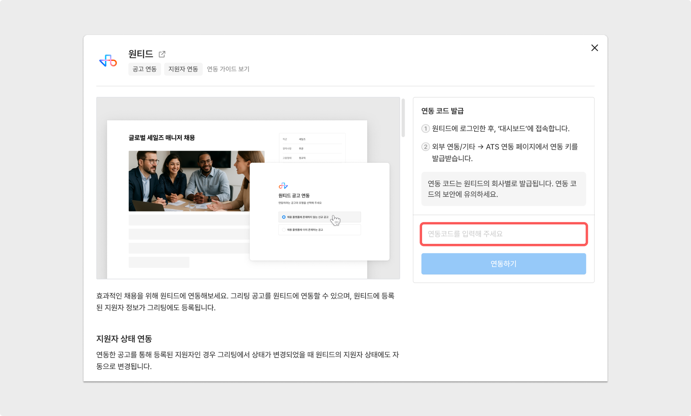 원티드에서 발행한 서비스 연동 코드를 입력해 주세요. (빨간색 영역)