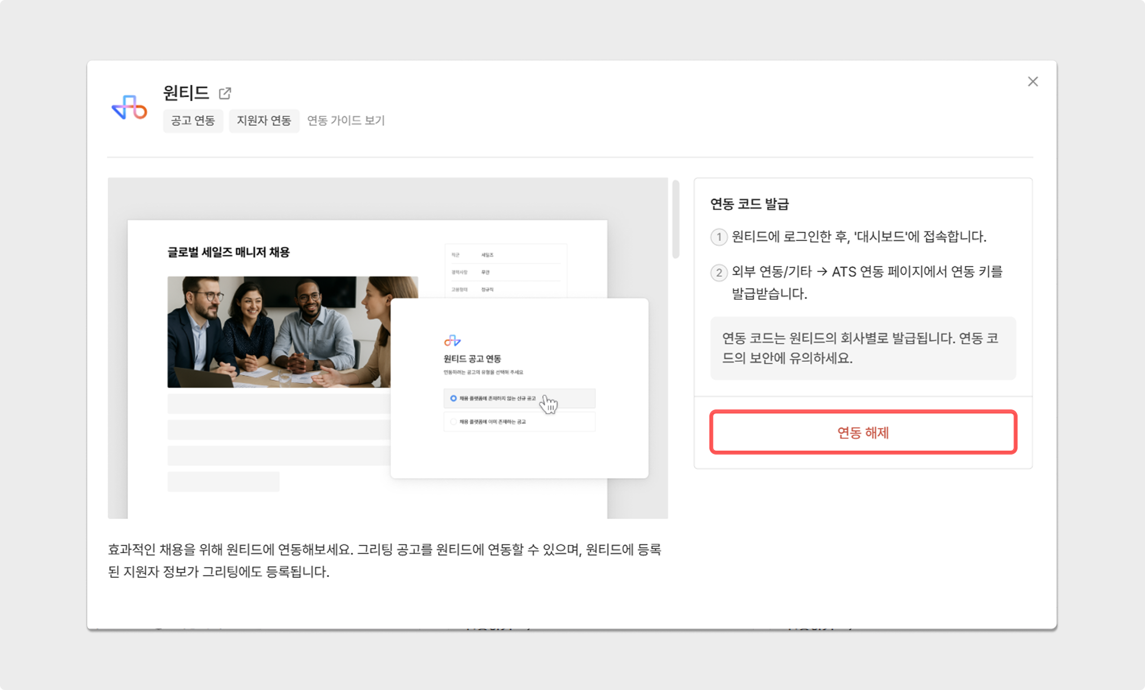 연동된 공고를 그리팅에서 삭제한 경우 연동 해제 및 원티드 내 공고가 마감됩니다.