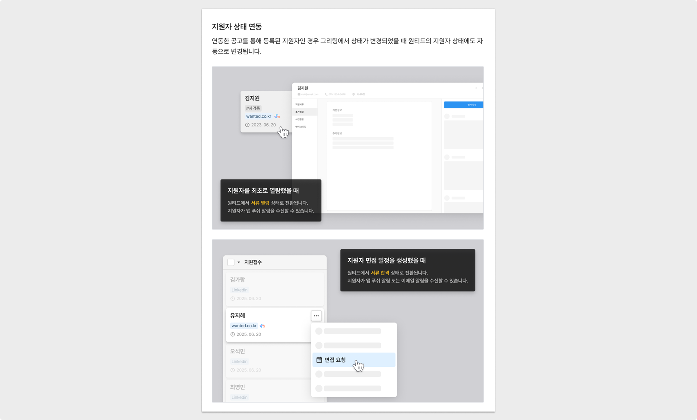 원티드 → 그리팅에 등록된 지원자의 상태를 변경하면, 원티드에 등록된 지원자의 상태에도 적용됩니다.