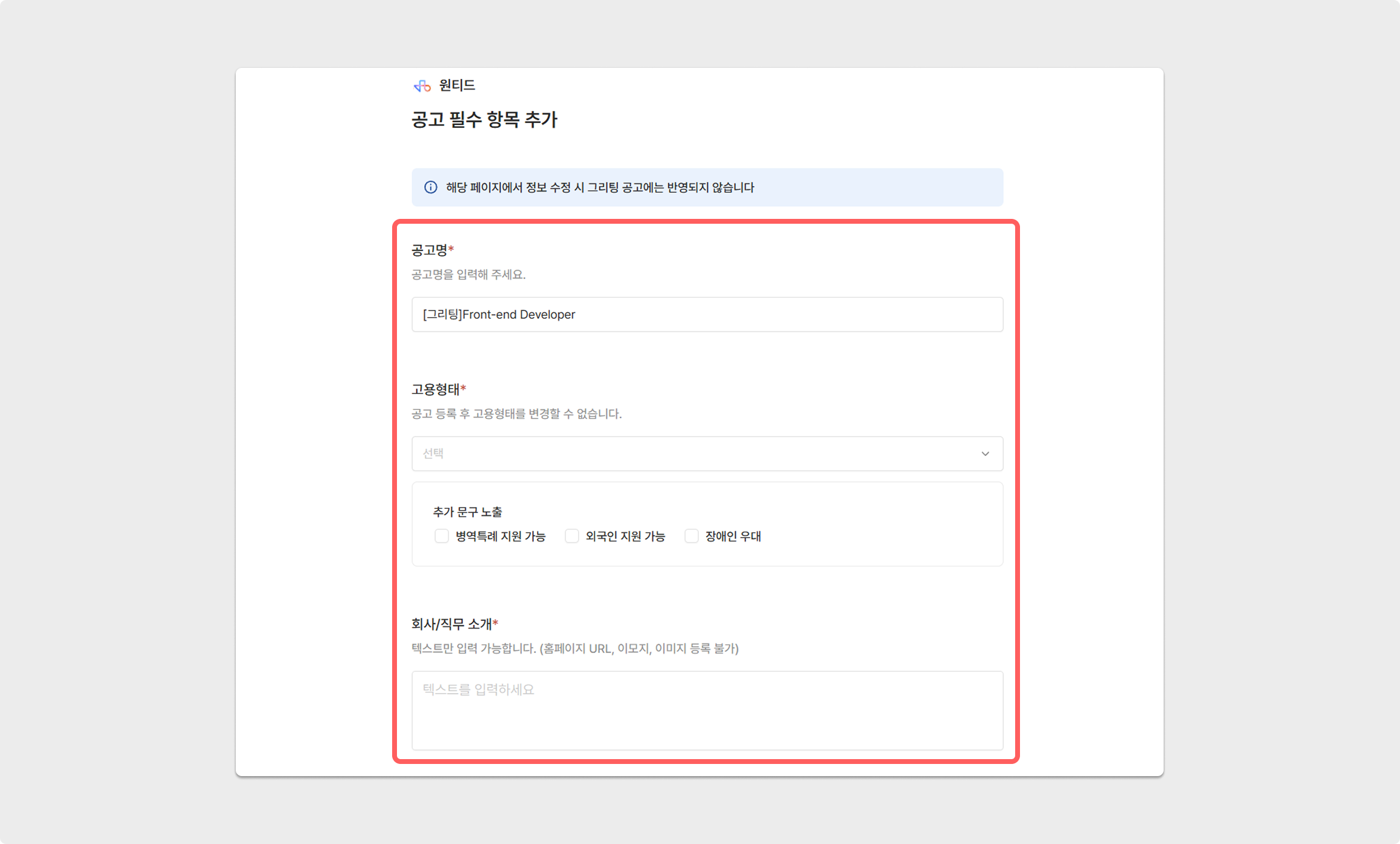 원티드 공고에 필요한 필수 항목을 추가하거나 검토해 주세요.