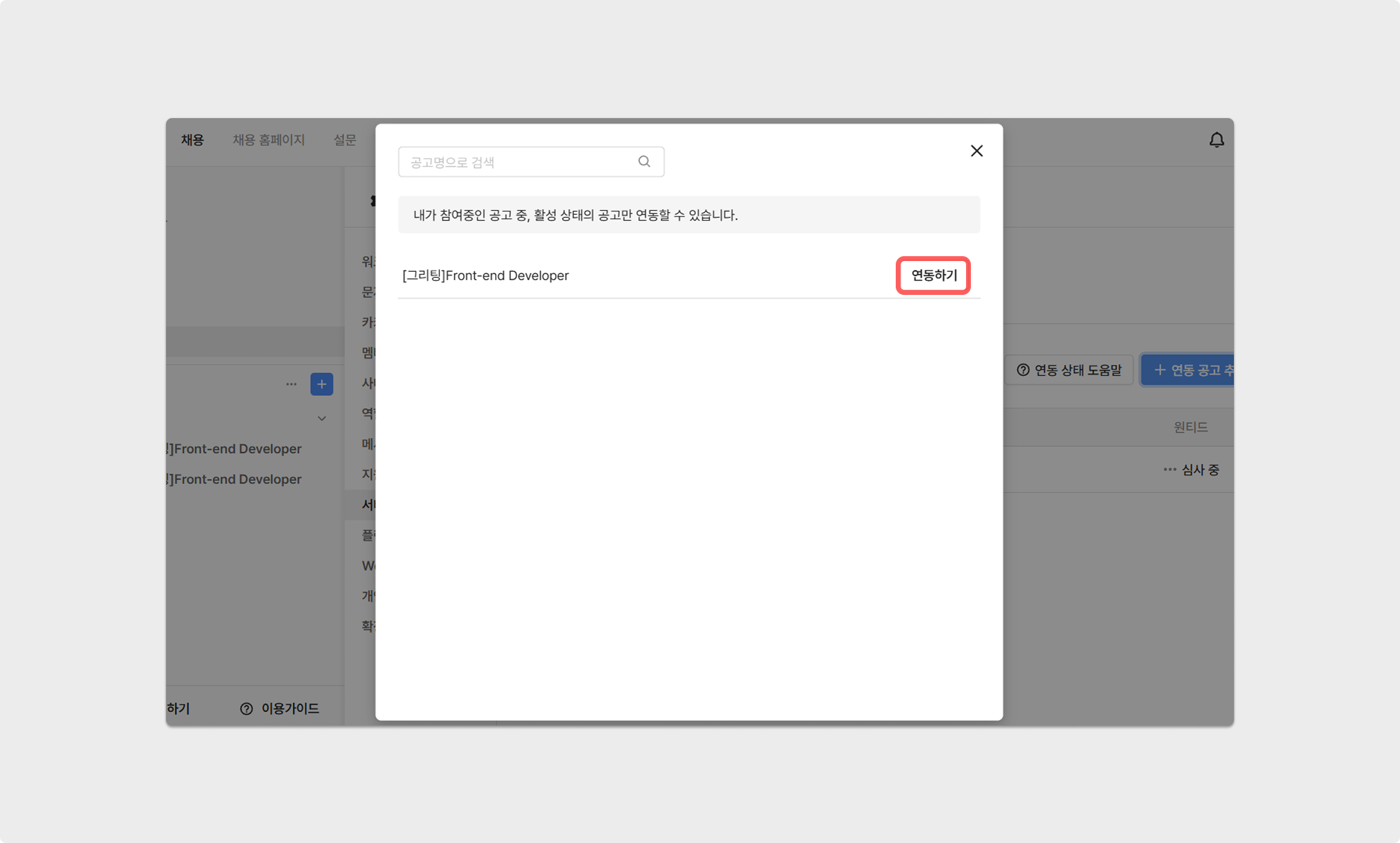 본인이 채용팀으로 참여 중인 공고 중 원티드와 연동되지 않은 활성화 상태의 공고 목록이 나타나며, 연동하기 버튼을 통해 각 공고를 연동할 수 있습니다.